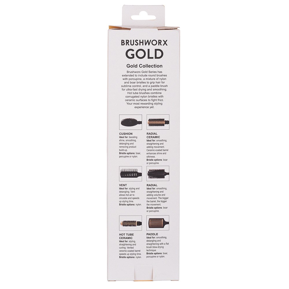 Brushworx Gold Oval Cushion Brush is your most rewarding styling experience yet. Designed with a flexible cushion base, this brush gently detangles, smooths and styles, as well as removing product build-up. A great finishing brush for all hair types, including hair extensions and wigs. Boar bristles create smooth, sleek results and are gentle on the scalp, distributing hair’s natural oils for a lustrous finish.