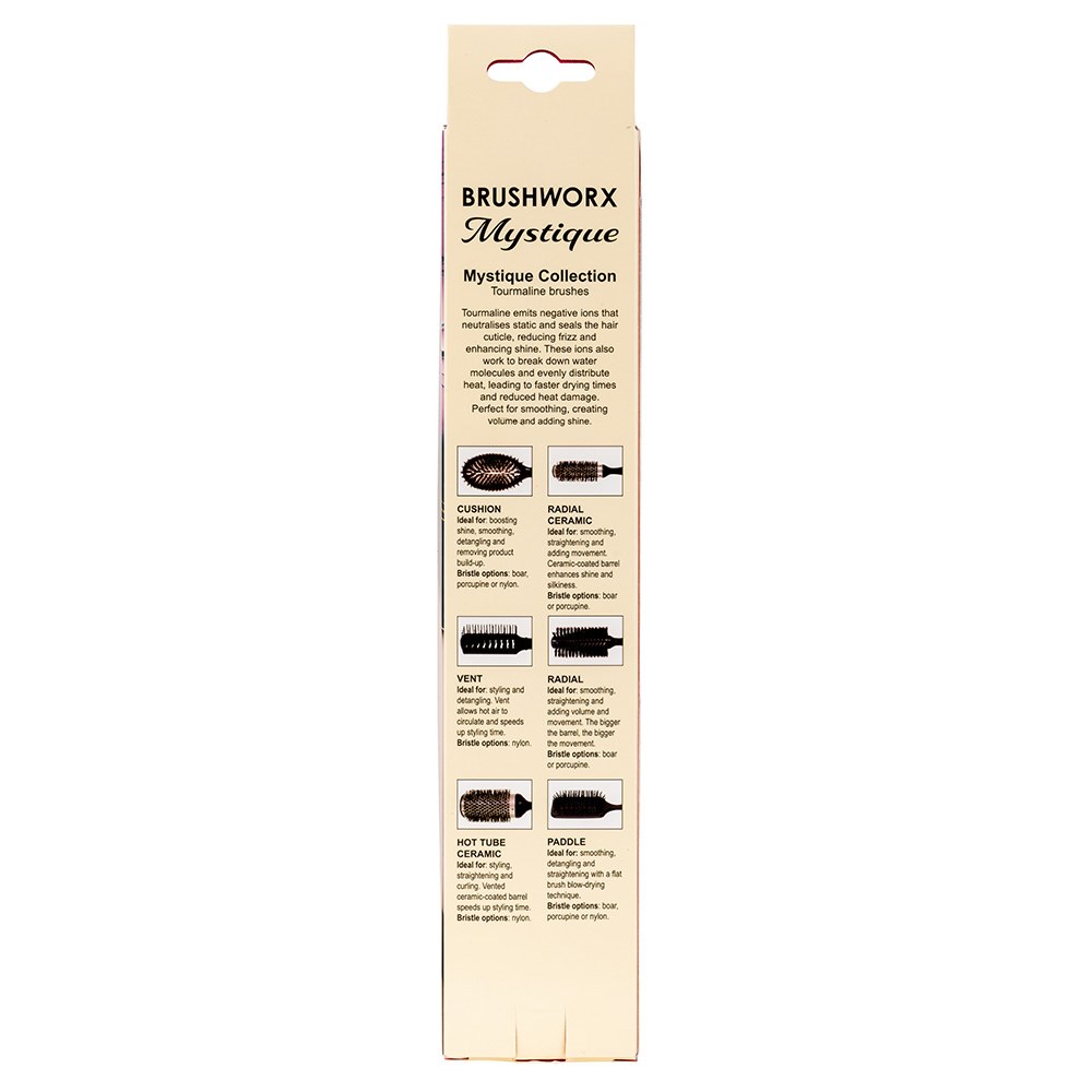 The power of tourmaline to effortlessly neutralise static, reduce frizz and enhance radiant shine. Brushworx Mystique Hot Tube Hair Brush Medium utilises tourmaline’s superior negative ion output for shinier, smoother and silkier styling. A stylist’s favourite, this hot tube brush accelerates your blow-dry, courtesy of the combination of hollow vented barrel and tourmaline helping to break down water molecules while evenly distributing heat. Best for all styles of blow-drying, particularly volume, waves and soft curls. Nylon bristles for perfect grip and tension. Rubberised handle for comfortable, non-slip hold. From Brushworx, the 100% Australian-owned brush authority.