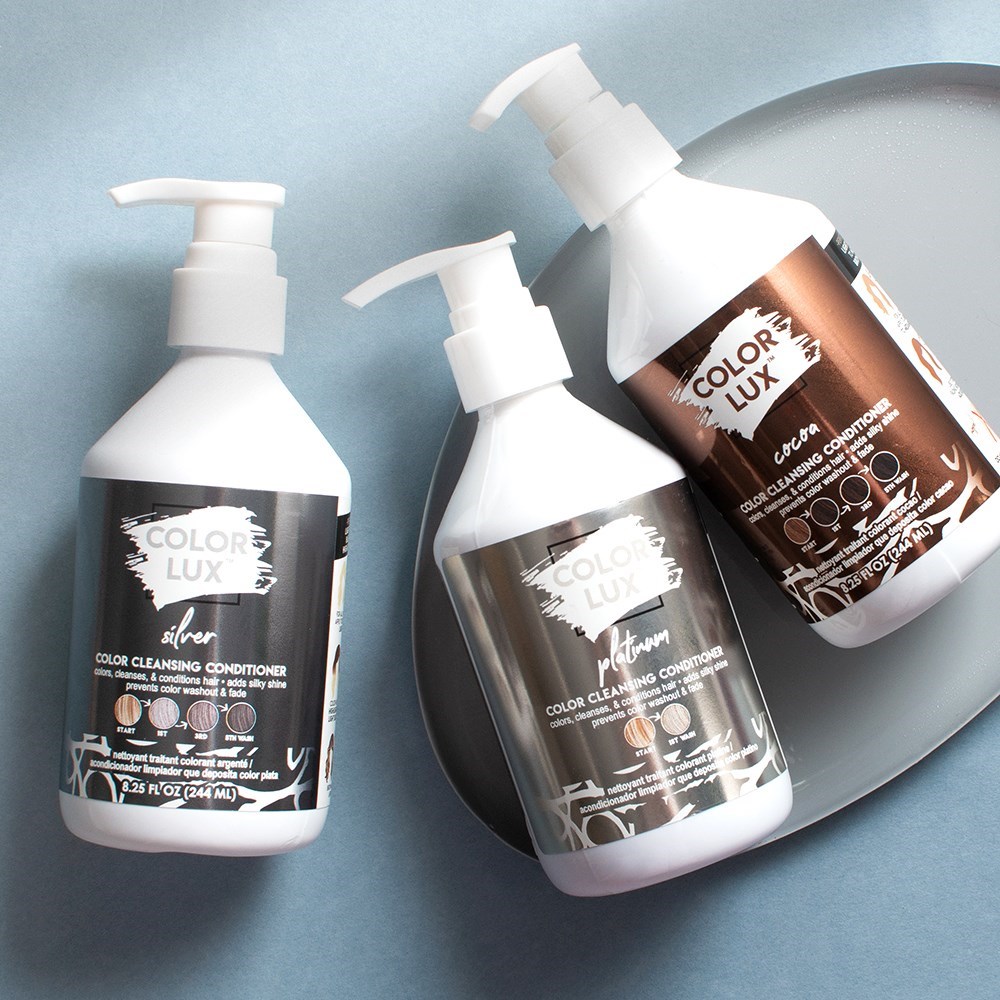 Deposit buildable colour with every wash. Color Lux Colour Cleansing Conditioner Platinum cleanses, conditions and colours - good things come in threes! Designed to gently cleanse and condition hair while depositing colour pigments, adding beautiful hues to hair. The more clients use, the more vibrant the colour. Intensifies and maintains existing hair colour between salon visits. Blended with coconut oil for alluring shine.