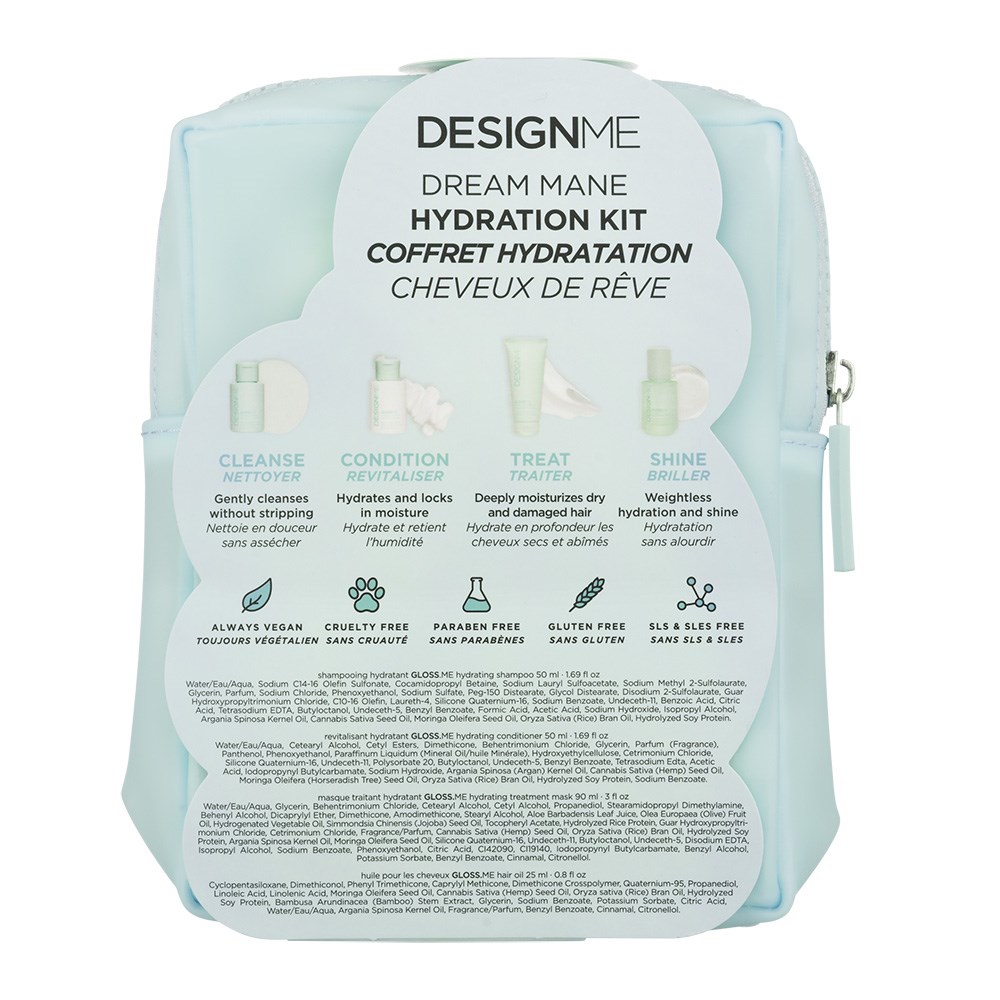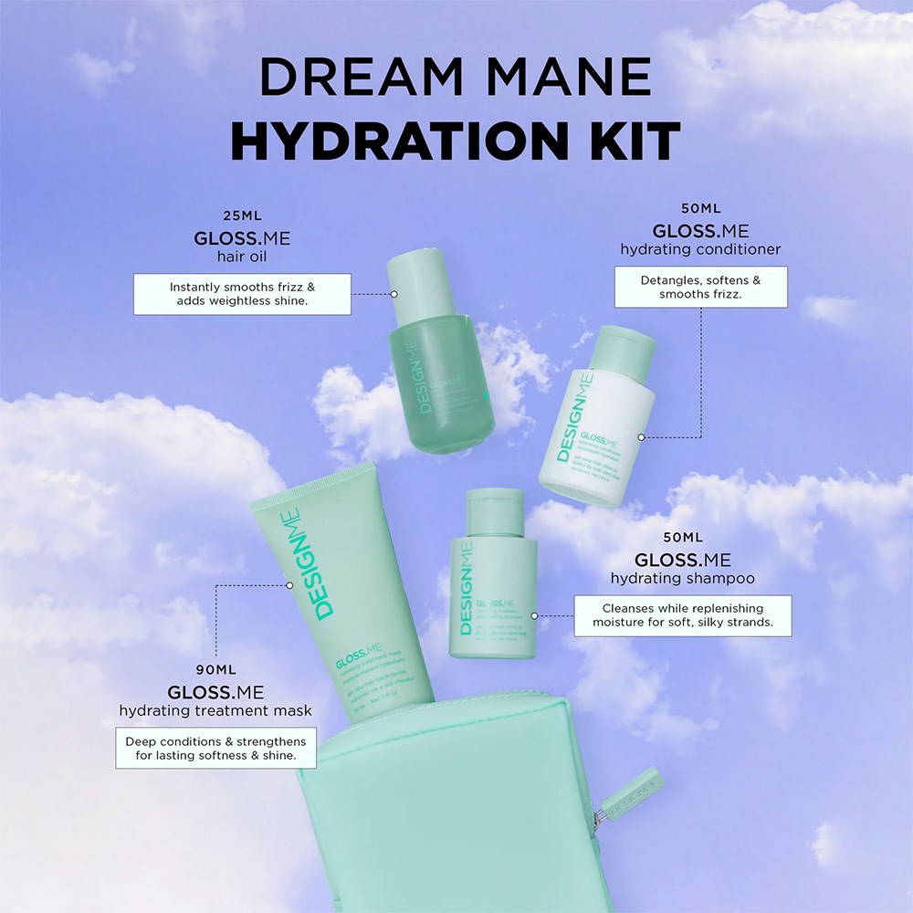 The magic of glossy, hydrated strands with this limited edition kit! DESIGNME Dream Mane Hydration Kit features the complete Gloss.ME hydration and shine collection in mini sizes. This dreamy set is designed to moisturise, smooth frizz, boost shine and make hair more manageable. Ideal for dry, dehydrated and frizz-prone hair in need of extra hydration and shine. Vegan, cruelty-free, gluten-free, paraben-free and SLS/SLES-free.