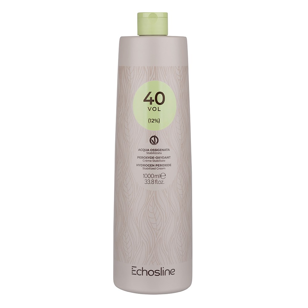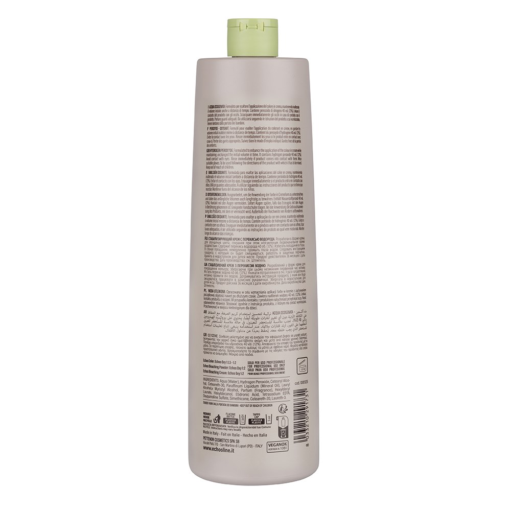 100% vegan, elite peroxide. Made in Italy, Echos Color Vegan 40 Volume Hair Peroxide is formulated to enhance the application of colour. This stabilised cream contains hydrogen peroxide 40 volume (12%). Designed for exceptional performance while maintaining the integrity of hair. Best used with the Echos Color Vegan range for even, consistent lift.