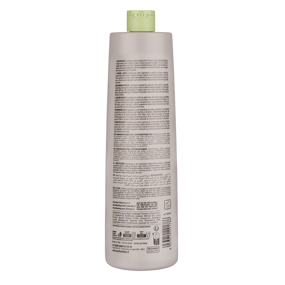 100% vegan, elite peroxide. Made in Italy, Echos Color Vegan 7 Volume Hair Peroxide is formulated to enhance the application of colour. This stabilised cream contains hydrogen peroxide 7 volume (2.1%). Designed for exceptional performance while maintaining the integrity of hair. Best used with the Echos Color Vegan range for even, consistent lift.