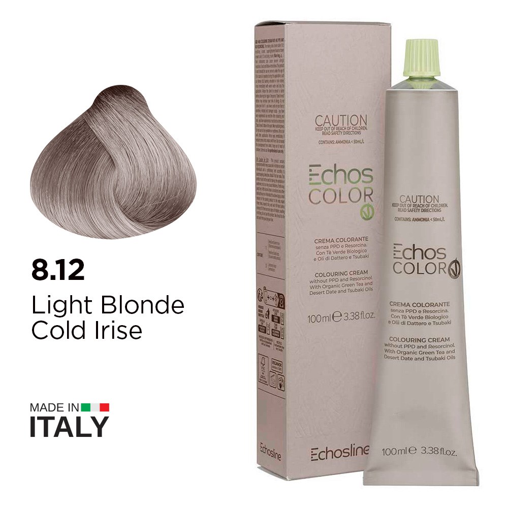 Incredible depth and longevity with reduced impact. Echos Color Vegan Hair Colour 8.12 Light Blonde Cold Irise respects professionals, consumers and the environment. This 100% vegan colouring cream is formulated without paraphenylenediamine (PPD) and resorcinol. Rich, long-lasting permanent hair colour boosted by green tea extract for longevity, desert date oil for revitalisation and Tsubaki oil for shine. Made in Italy, this is elite hair colour turned vegan.