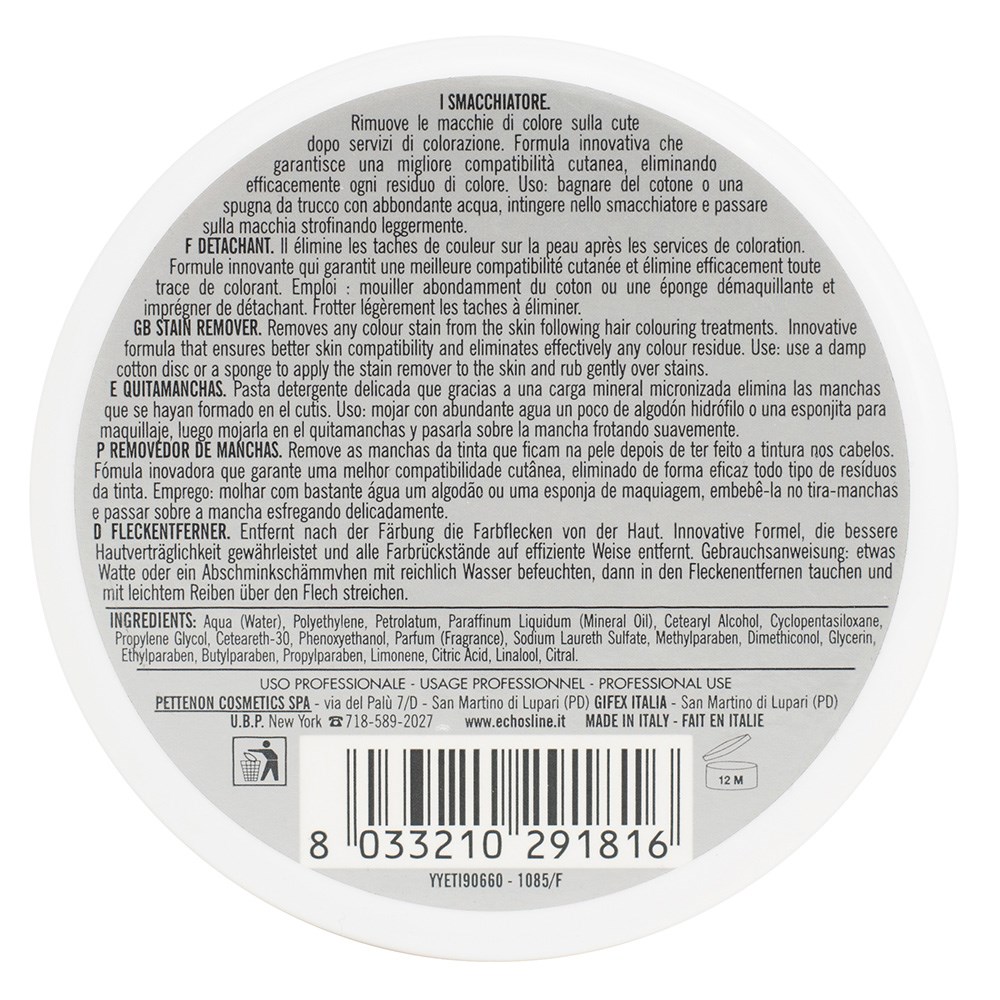 Remove hair colour stains and residue without a trace with Echos Hair Colour Stain Remover. Micronized crystals gently scrub any remaining colour from the skin. This professional formula is gentle enough to use on the facial and hairline areas. Made in Italy by Pettenon.