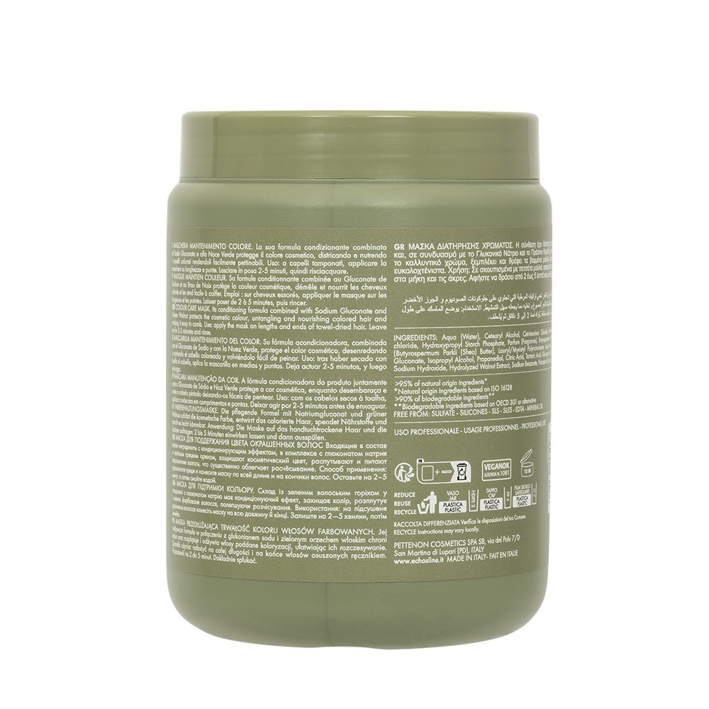 Protect colour, the smart vegan way. Echosline Colour Protection Complex System is powered by green walnut and sodium gluconate to defend against colour fade while improving hair’s structural integrity. Echosline Colour Care Mask Hair Treatment 1L deeply conditions, improves manageability and nourishes coloured hair. Hair is left soft, strengthened, full-bodied and shiny. >95% ingredients of natural origin*. >90% biodegradable ingredients**. Formulated without silicones, Sodium Lauryl Sulphate (SLS) and Sodium Lauryl Ether Sulphate (SLES).
