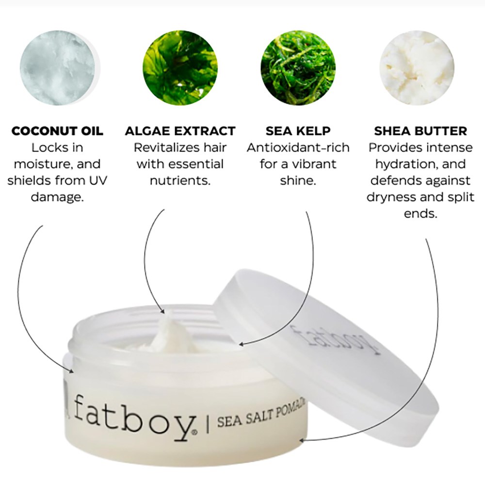 When you want to look like you spent the day at the beach and have the perfect hair. Fatboy Sea Salt Pomade gives you effortless texture and separation without the crunchiness or dehydration of your traditional salt spray. Sea kelp and algae extract make this pomade rich in antioxidants and give the hair a healthy-looking, shiny boost. Coconut oil and shea butter help lock in moisture and enhance strength while protecting your hair. Get ready to top the charts with stylist-grounded, performance-driven Fatboy.