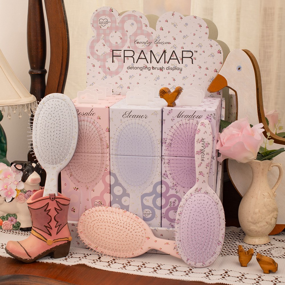 Wildflower whimsy meets detangling! Framar Detangler Hair Brush Display 9pc Country Charm features 9 brushes in Rosalie, Meadow and Elanor. Each brush effortlessly detangles wet or dry hair with ease. Ideal for all hair types, including wigs and hair extensions. Flexible bristles deliver pain-free brushing. Not only a detangler, these hair brushes are also great at brushing colour or toner through hair for even application or assist in styling, such as brushing out curls. Retail display is ideal for counters and shelves.