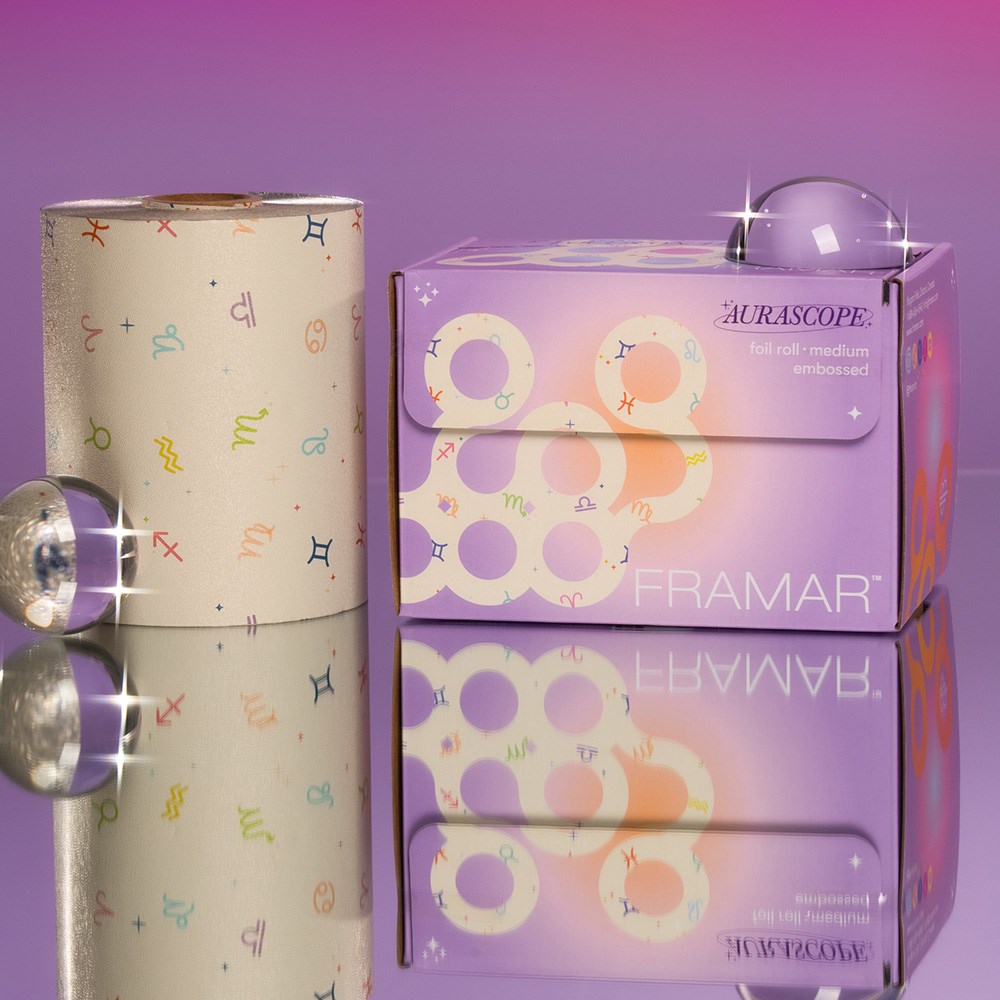 It’s written in the stars! Framar Embossed Foil Roll Aurascope is the perfect non-slip grip embossed foil. The embossed texture prevents slippage so you can breeze through any colouring service. High quality foil in horoscope print guaranteed to make every process more fun for you and your client. Rolls out easily with no-hassle cutting. Simply cut to your desired length with the inbuilt cutting blade in the dispenser box. Great for long hair and minimises waste.