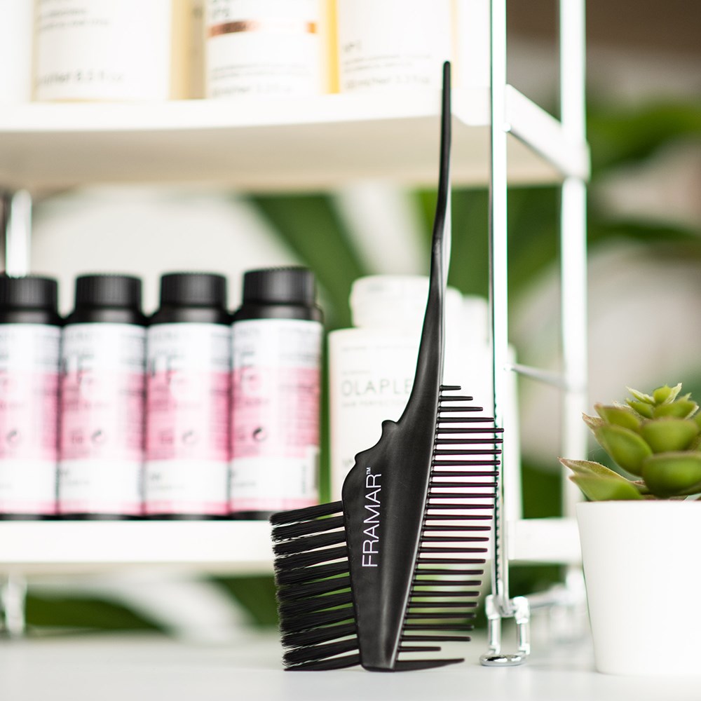 See you on the flip side! Framar Emperor Colour Tint Brush is a double-sided brush with bristles on one side and a comb on the other. Paint on colour and distribute it though hair using the comb in one quick flip of the brush. Tapered handle is ideal for sectioning hair during colour applications. Framar’s famous AccuSoft bristles are tapered to pick up and distribute colour to hair evenly, quickly and precisely.