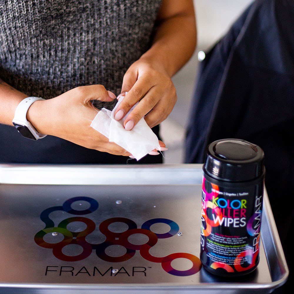 These wipes are worth the hype! Pop the top, grab a wipe and say good riddance to stubborn dye stains with Framar Kolor Killer Wipes. These convenient wipes easily remove hair colour stains from hands, neck and face and are a must have in your collection of hair colouring accessories. The fresh, clean scent leaves you and your client smelling great. Perfect for cleanup on all skin types. 100 wipes per easy access, popup top container.