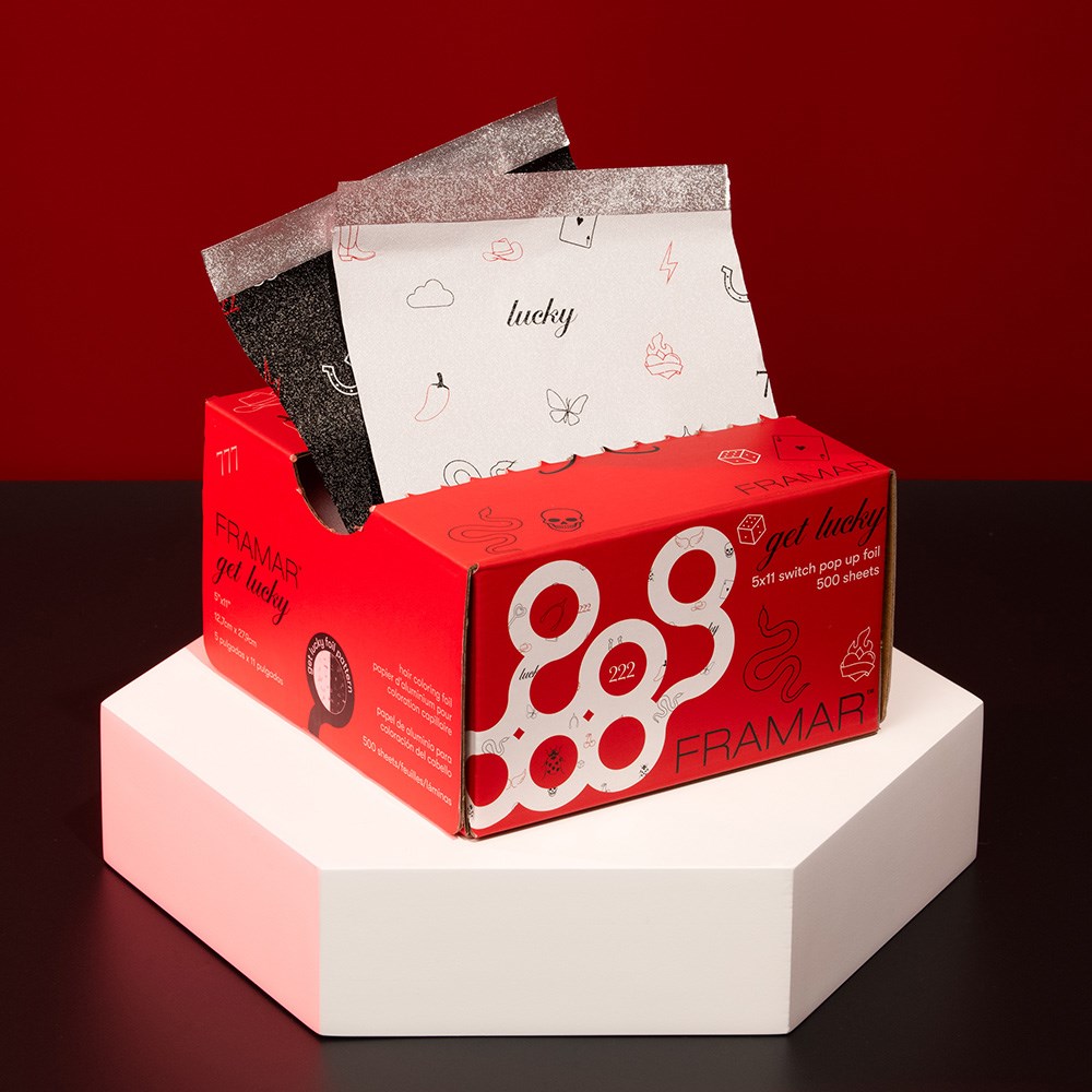 Lucky you, you just found your new good luck charm! Framar Pop Up Foil in Get Lucky is pre-cut, pre-folded and ready when you are. The embossed texture prevents slippage so you can breeze through any colouring service. High quality hairdressing foil in alternating sheets of black and white with good luck charms. Featuring the signature, perforated push up base, designed to keep foils extra perky for ultimate convenience. Includes 500 sheets with each sheet measuring 12.7cm x 27.94cm.