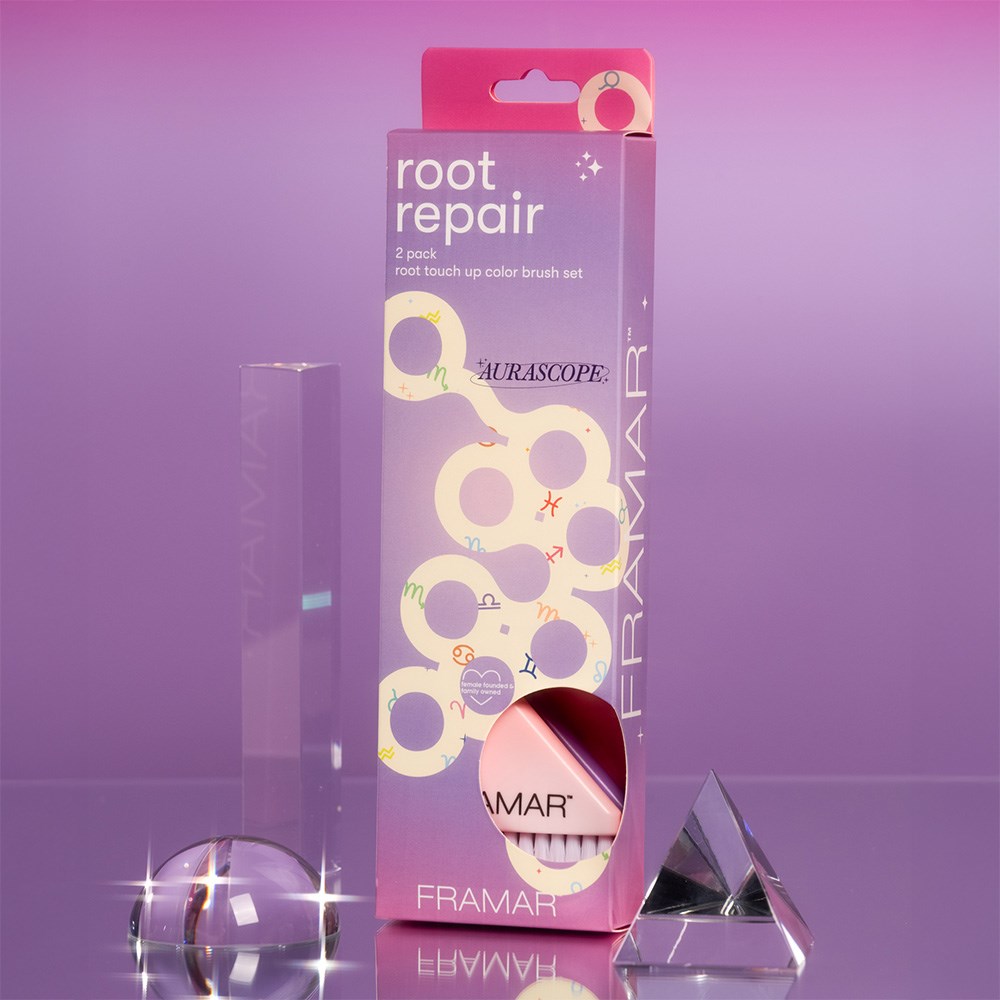 Precision is the root of it all! Framar Root Repair Brush 2 Pack Aurascope is a root touch-up brush duo with AccuSoft bristles. Softer and shorter bristles are perfect for touch-ups and smudging the hairline. Flexible tip for easy parting. You deserve the tools designed for the job because root touch-ups are our bread and butter. This two pack upgrades your go-to service.