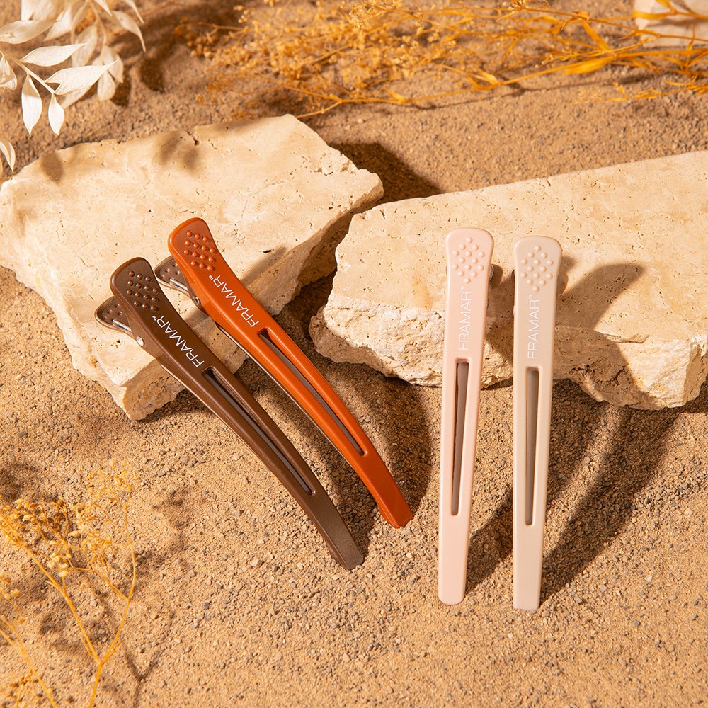 Effortlessly section hair without creasing or denting. Framar Super Sectioner Clips 4pk Terra Neutrals allow for seamless styling with every service. Strong but comfortable grip with cushion compression. Self-locking mechanism with silicone strip to keep hair in place without creasing. Chemical resistant material. Four pack in neutrals.