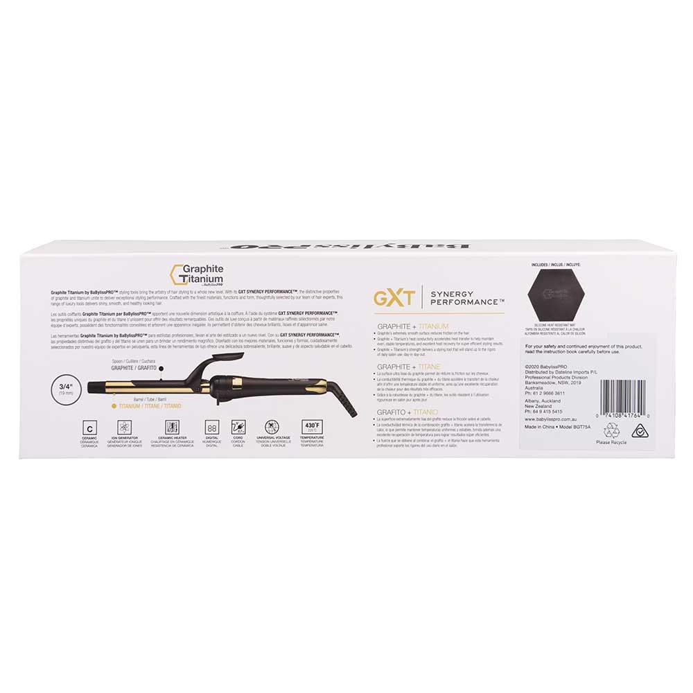 Ultra-shiny, ultra-smooth and ultra-silky curls and waves in mere moments. A first for curling irons: Graphite Titanium by BaBylissPRO Ionic Curling Iron features an inbuilt ion generator. Graphite spoon for extremely low friction. Titanium barrel for super-fast heat conduction. Ceramic heater for instant heat-up, exceptional stability and recovery. The ultimate in heat, glide and durability for day-in, day-out salon use.