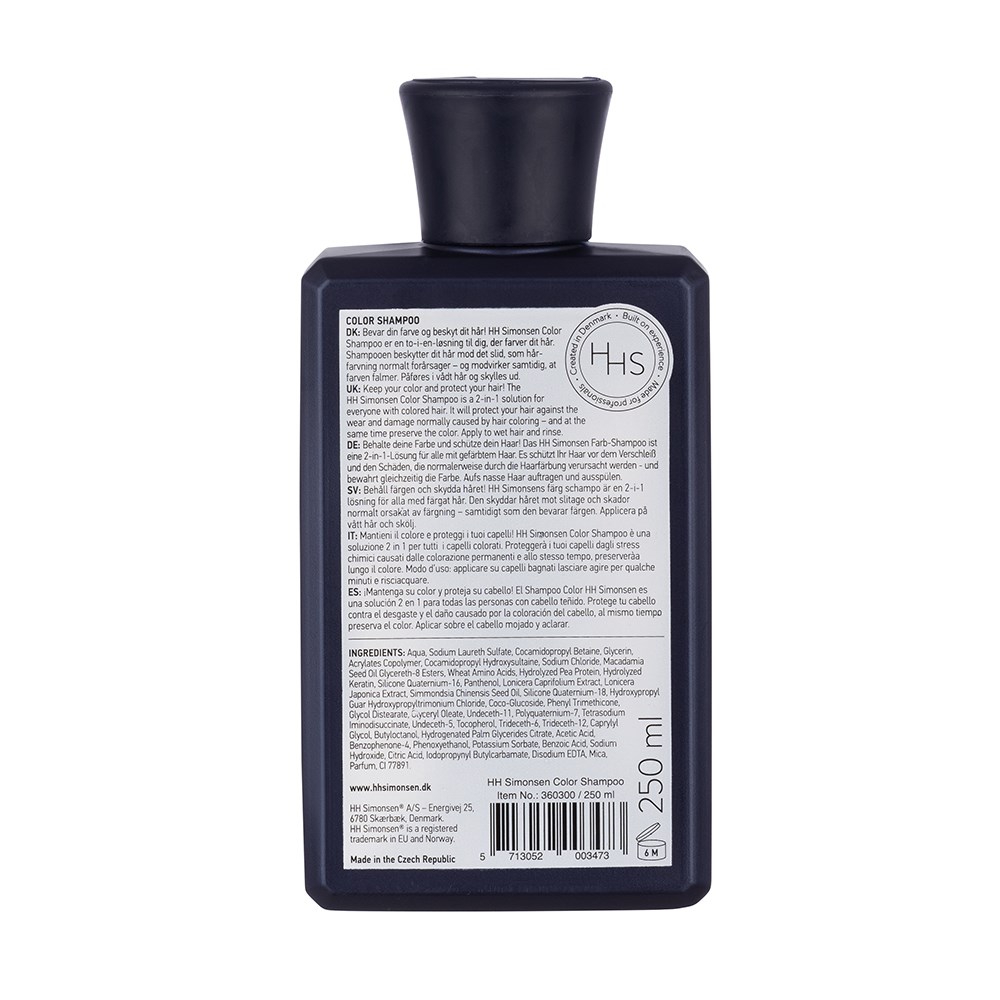 Keep your colour and protect your hair. HH Simonsen Colour Shampoo is a 2-in-1 solution for maintaining vibrant colour. This shampoo tackles the two greatest challenges of coloured hair: prevention of colour fade and protection against the damaging colour process. Nourish and fortify hair with wheat-based amino acids, keratin, macadamia and jojoba oil to help hair retain strength and shine. Hair is left radiant, smooth and shiny. This is ultra-effective colour care and protection.