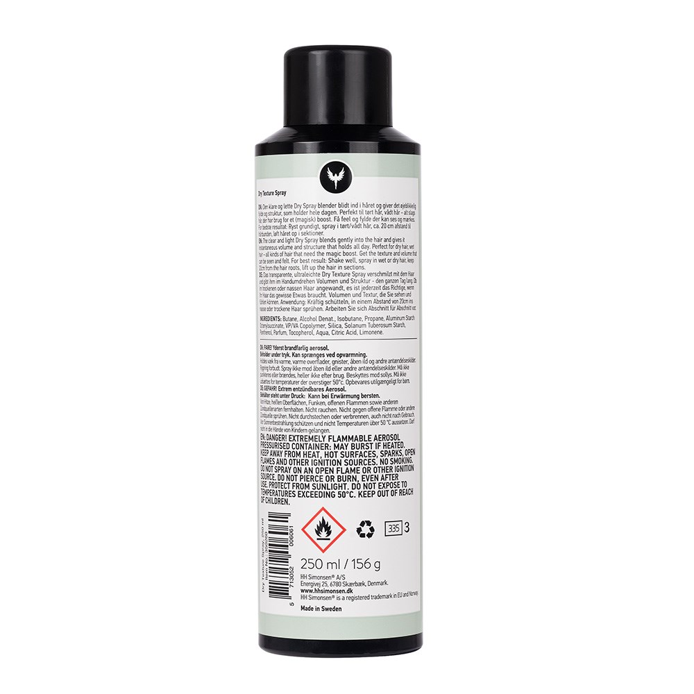 The luxury of fullness and structure. HH Simonsen Dry Texture Spray is a lightweight spray which gently blends into the hair, providing instant fullness and structure which lasts all day. Perfect for both wet and dry hair, any hair type will enjoy an extra boost. Infused with nourishing panthenol to fortify hair from within. A great alternative to dry shampoo, this dry spray texturises, volumises and holds. Fullness and lift you can see and feel.