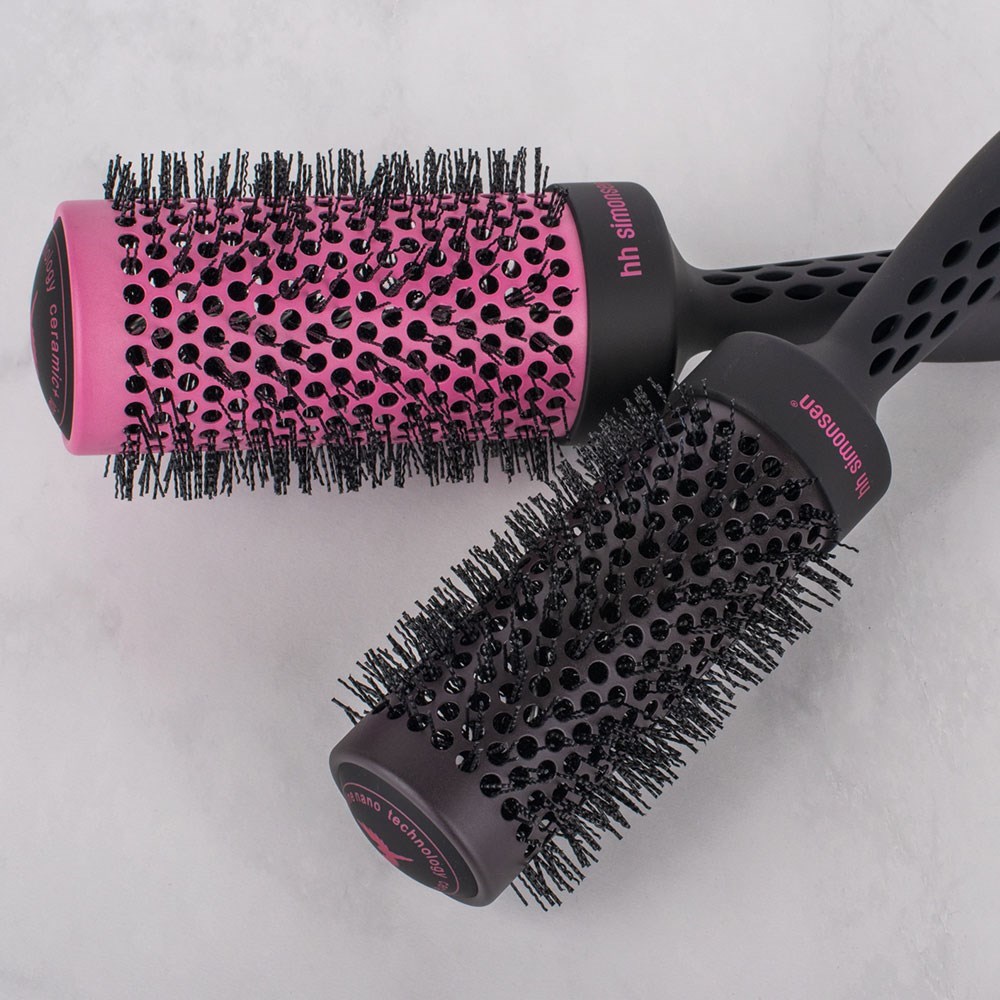 Danish design introduces the soulmate of hair dryers. HH Simonsen Heat Brush Medium is designed to let air pass through the brush head and thus add volume to the hair. When heated over 60°C, the black barrel turns pink to indicate high temperature. The ceramic barrel retains heat, while zigzag bristles ensure better grip when brushing. Faster blow-drying, better styling.