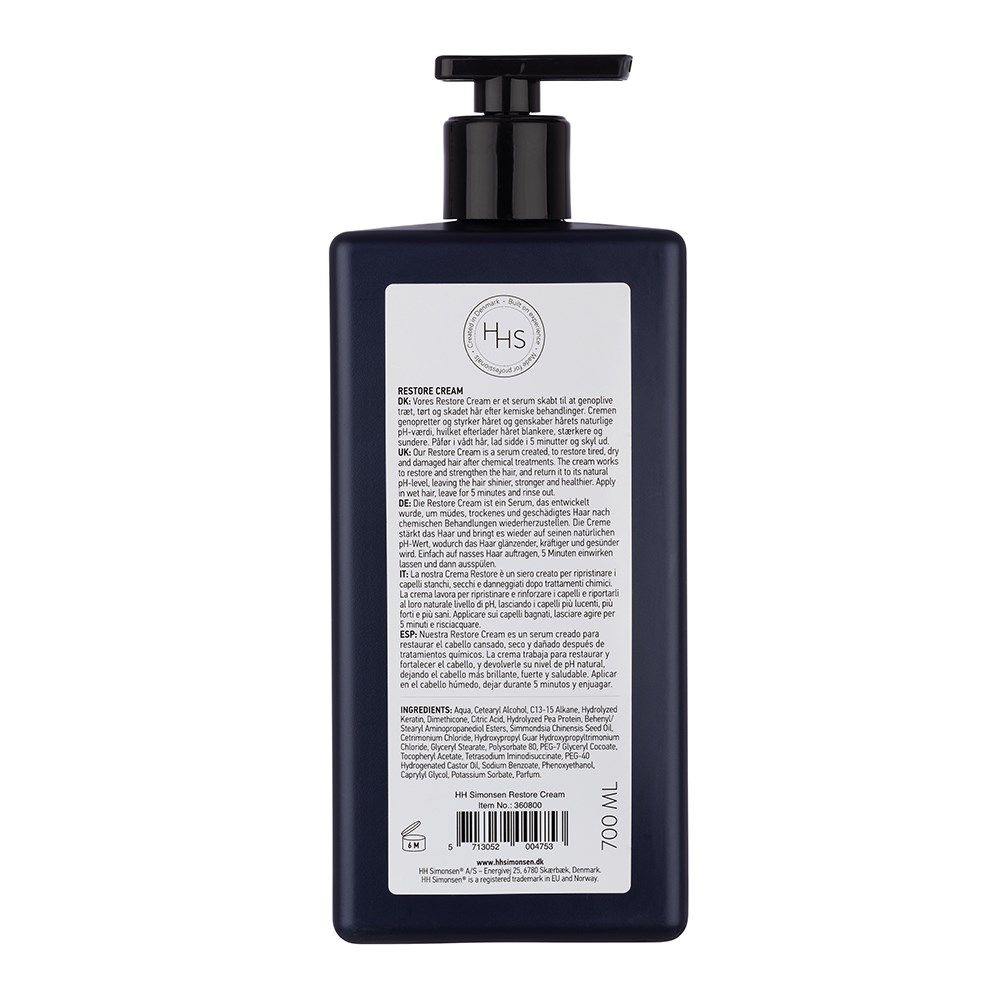 Get hair back on track. HH Simonsen Restore Cream 700ml is created to renew and restore tired, dry and damaged hair after chemical treatments. This clever hair treatment cream strengthens hair, returning it to its natural pH level, leaving hair shinier, stronger and healthier looking. Damage, frizz and split ends are reduced. Enriched with vitamin E and jojoba oil to nourish hair from within.
