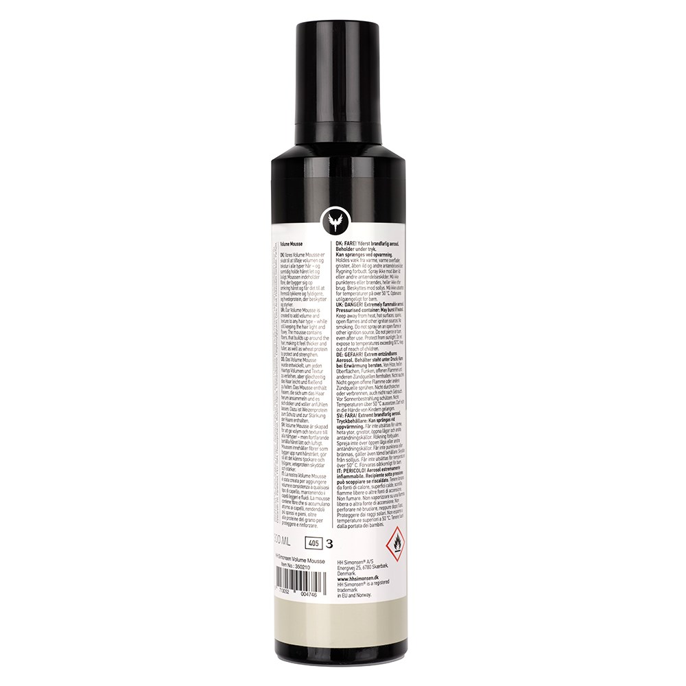 HH Simonsen Volume Mousse is created to add volume and texture to any hair type, while still keeping hair light and flowy. This innovative mousse contains fibres which build up around the hair, making hair feel thicker and fuller, as well as providing hold. Enriched with wheat protein to protect and strengthen. Styling gets bigger and better with HH Simonsen. Created in Denmark. Built on experience. Made for professionals.
