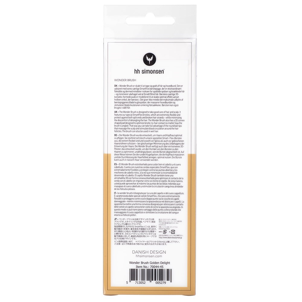 A brush is not just a brush. HH Simonsen can prove it. Danish design at its best, HH Simonsen introduces the miraculously gentle Wonder Brush in Golden Delight. By hairdressers for hairdressers, the Wonder Brush features Smartflex bristles which are extremely flexible and protect against damage. 3D convex shaped pad design optimises bristle-to-hair contact. Large ball tips stimulate the scalp. Simply, easier detangling with less hair breakage.