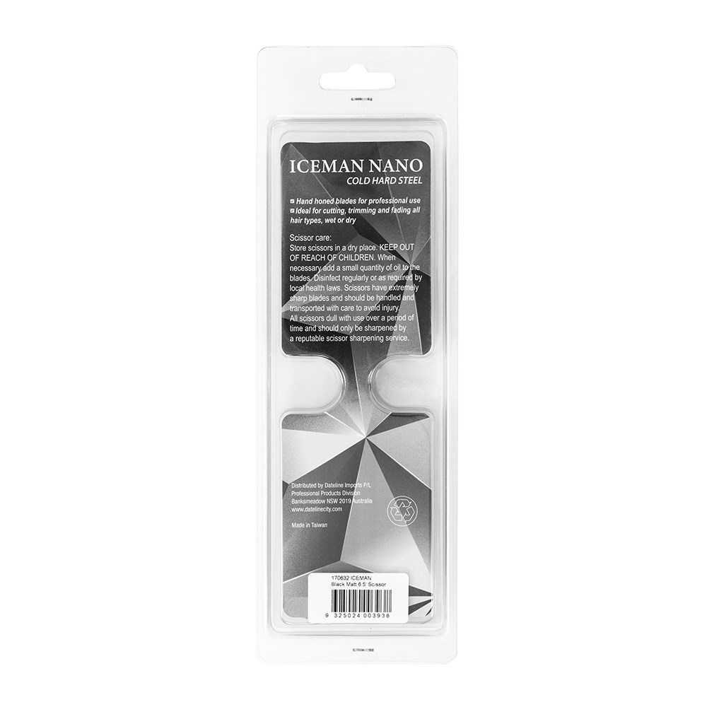 Luxurious yet highly affordable. Iceman Nano 6.5” Hairdressing Scissors Matte Black feature precise micro-serrated and hand-honed stainless steel blades for truly exceptional cutting performance. A great choice for precision work, these scissors have superb ergonomics with an offset handle and removable finger rest. Ideal scissors for apprentices or a backup pair for your hairdressing kit.
