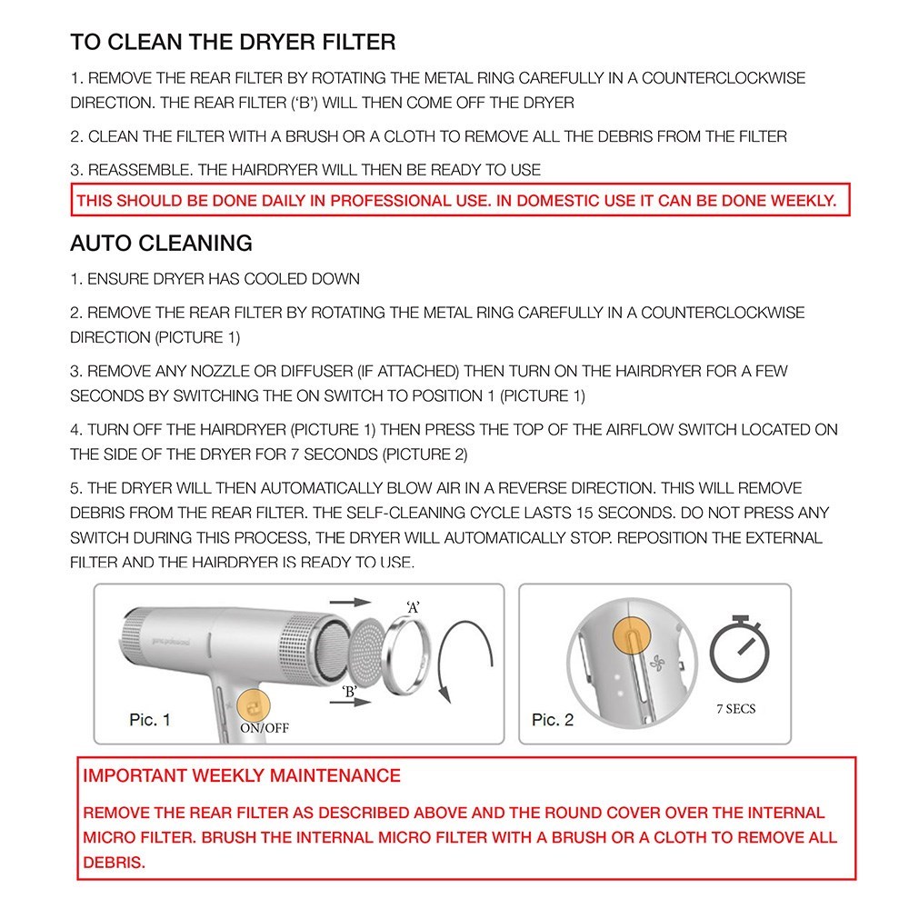 - For professional use – dryer filter should be cleaned daily
