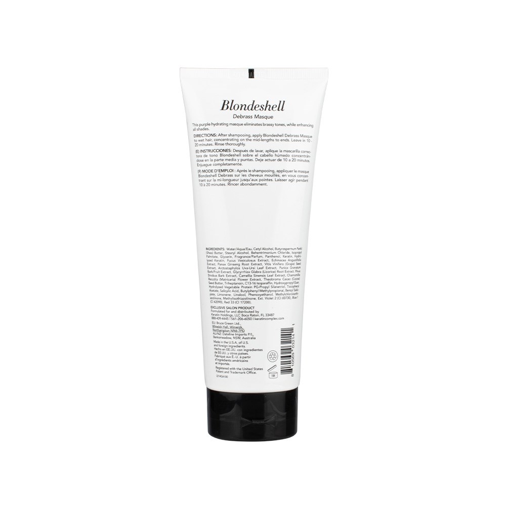 Eliminate brassy tones and rebuild resilience with this hair treatment. Keratin Complex Blondeshell Debrass Hair Masque is a purple hydrating masque which eliminates brassy tones while enhancing all shades and types of hair, including dry, damaged and keratin-treated. Keratin Complex’s signature keratin rebuilds essential proteins within the hair for improved elasticity. The purple formulation neutralises brassiness for instant renewal. An exclusive blend of antioxidants, oils and extracts strengthens and repairs weak and fragile hair. Shea butter nourishes and helps retain moisture within hair.