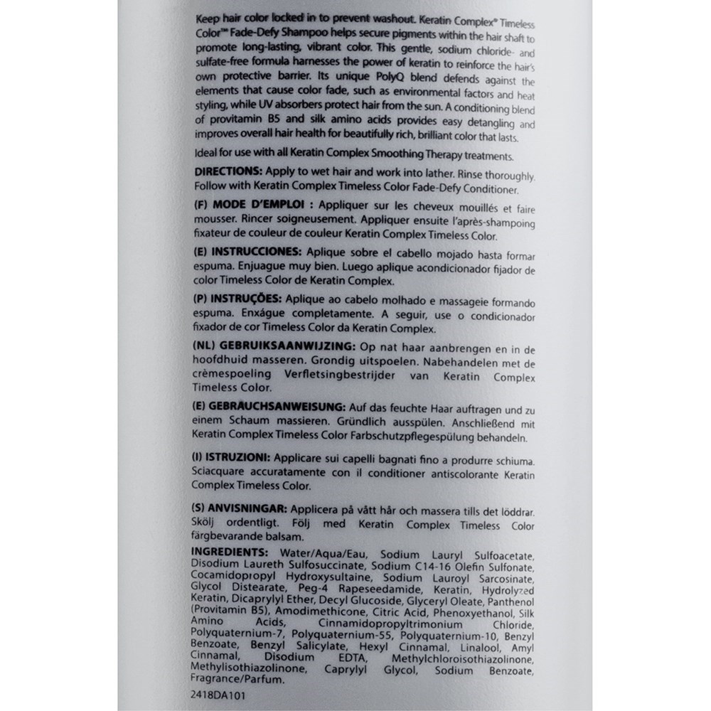 Keratin Complex’s Timeless Colour Fade Defy Shampoo helps secure pigments within the hair shaft to promote long-lasting, vibrant colour. This gentle, sodium chloride- and sulfate-free formula harnesses the power of hydrolysed keratin to reinforce the hair’s own protective barrier. Its unique PolyQ blend defends against the elements that cause colour fade, such as environmental factors and heat styling.