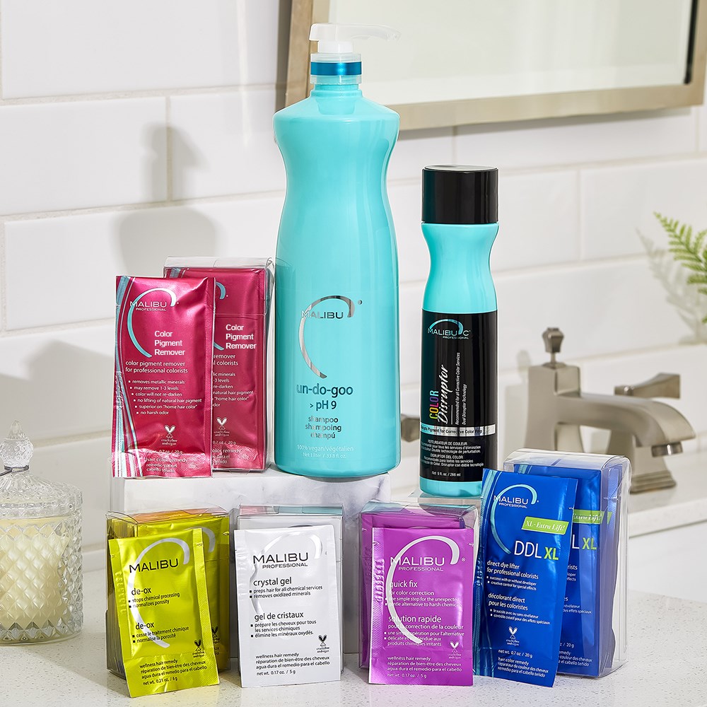 Disrupt and loosen dye with Colour Disruptor, used in conjunction with Colour Pigment Remover to eliminate up to three levels of unwanted oxidised colour. DDL XL Direct Dye Lifter effectively targets hard-to-budge direct dye pigments. Un-Do-Goo Shampoo removes product buildup and serves as the essential first step in any Malibu C salon service. Crystal Gel, Malibu C’s number one in-salon treatment, prepares the hair for all colour and chemical services by removing oxidised minerals. De-Ox stops peroxide processing and normalises porosity, while Quick Fix delivers immediate results by removing over-deposited toner within minutes at the shampoo bowl.