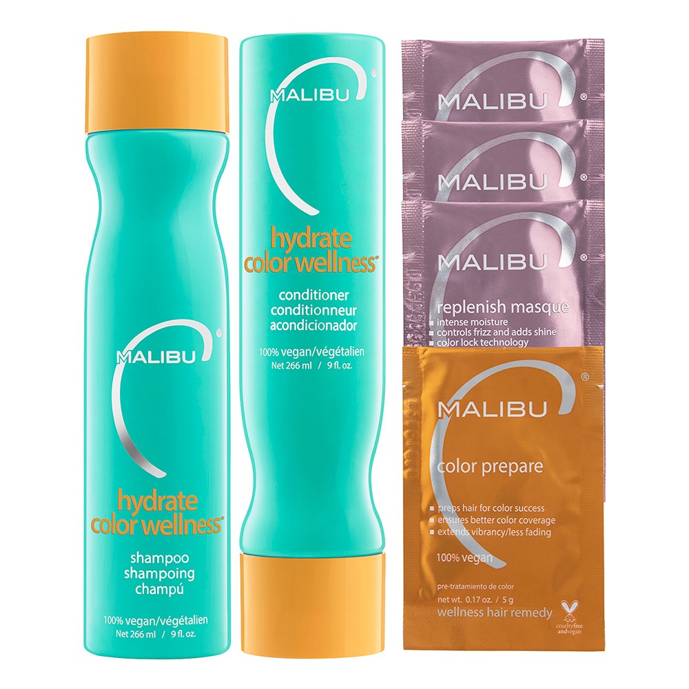 Discover longer-lasting, more vibrant colour with Malibu C Hydrate Colour Wellness Collection. This collection contains everything needed for revolutionary retention of colour. Starting with Hydrate Colour Wellness Shampoo to keep hues true, following with Hydrate Colour Wellness Conditioner with advanced colour-lock and continuing with 4 sachets x Replenish Hair Mask to repair damage and 1 sachet x Colour Prepare for colour prep. 100% vegan. Free from sulphates, gluten and added sodium chloride. Cruelty-free. Made in the USA.