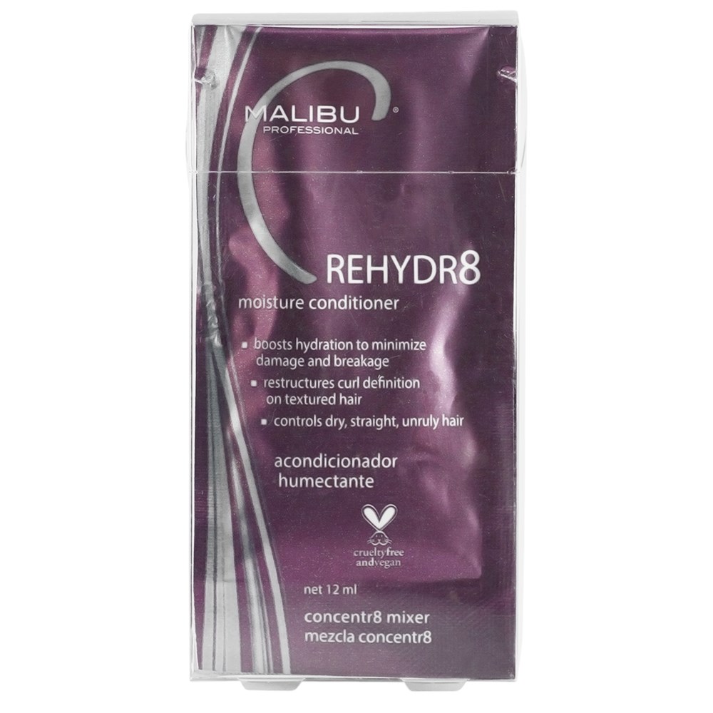 For the backbar by Malibu C Professional. Formulated without gluten, parabens and sulphates. Malibu C Rehydrate8 Moisture Conditioner 6pc Sachets, designed for hair in need of hydration and improved softness. This Concentr8 Mixer deeply penetrates to deliver a major moisture boost directly to nutrient-starved strands to totally transform dry, brittle hair into soft, touchable strands that have been brought back to life.
