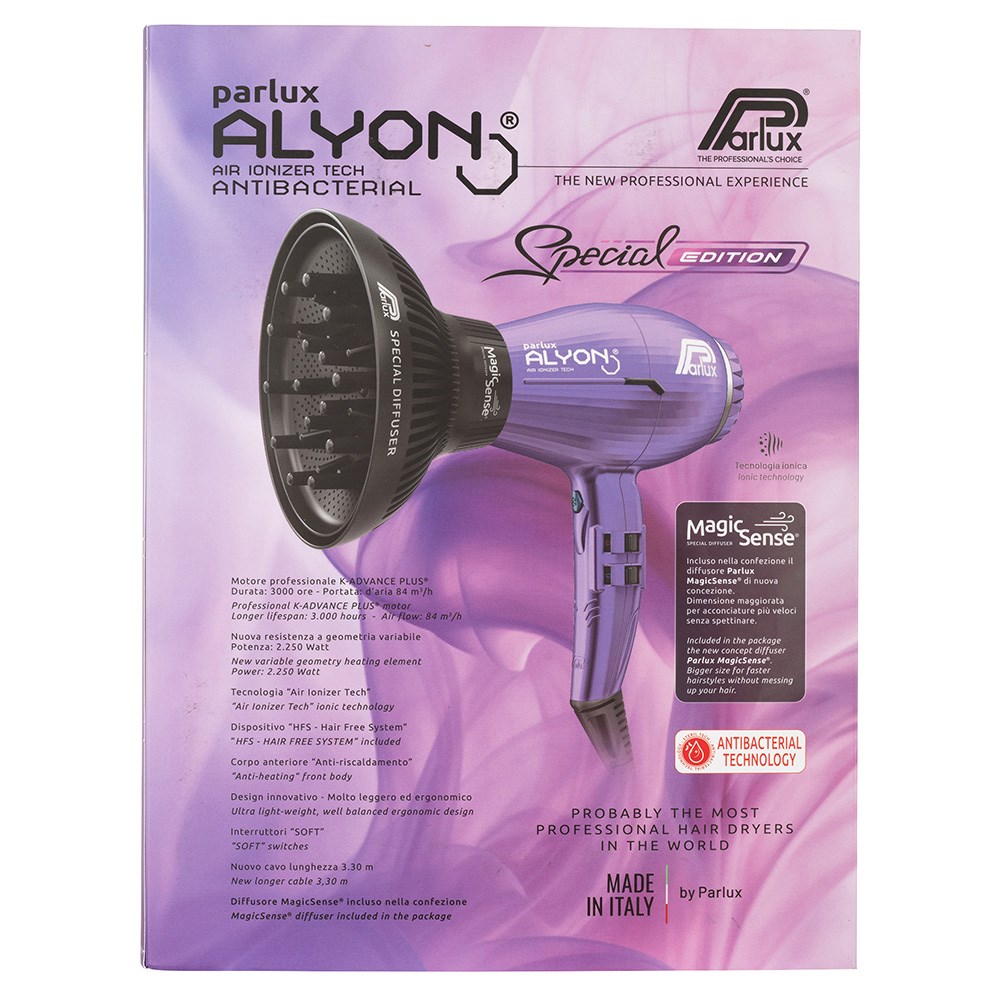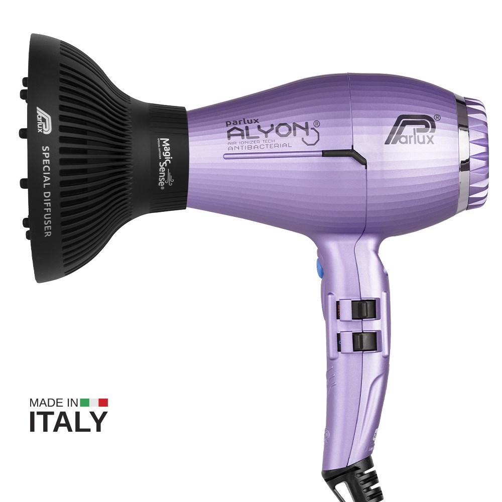 A hair dryer in full bloom. Parlux Alyon Air Ionizer Tech Hair Dryer And Diffuser Lilac is ultra-lightweight, ergonomic and perfectly balanced, designed to unleash creative styling. In lovely lilac, Alyon boasts 2,250 watts of potent power, concentrated airflow and a longer lifespan. Air Ionizer Tech creates smooth, lustrous results while being kinder to hair. Antibacterial surfaces with embedded silver help maintain hygiene. Eco-friendly philosophy. With over 40 years of experience, Parlux is at the forefront of professional hair dryer design. Includes Parlux MagicSense Diffuser with perfect temperature/airflow ratio.