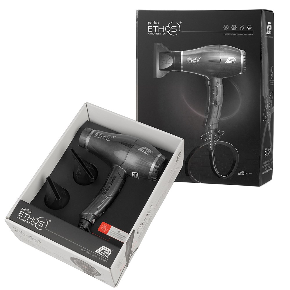 Express your talent by exploring new stylistic universes. Parlux Ethos Hair Dryer Titanium embodies digital excellence for styling without boundaries. Classic design meets digital innovation, delivering astounding performance, durability, lightness and power. Improve and customise your blow-drying experience. Professional digital motor with 2,300 watts and 88m³/h airflow for flawlessly fast drying. Nine combinations of temperature and speed. Air Ionizer Tech ionic technology for superbly silky results. Anti-heating front body, lightweight, perfectly balanced with an ergonomic handle. Patented special twisting cable offers unprecedented freedom of movement, allowing the cable to freely rotate 360°. Designed with exclusive texture and antibacterial paint. Two nozzles, including new slim, straightener effect nozzle.