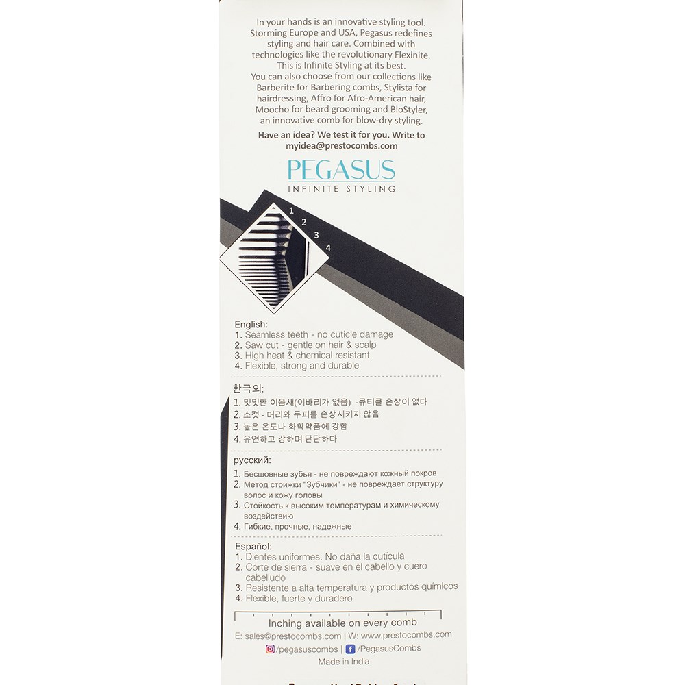 Storming Europe and the USA, Pegasus combs redefine styling. Combined with revolutionary Flexinite technology, Pegasus 101 Tail Comb is styling at its best. Flexinite Smart Comb Technology creates seamless teeth which are sensitive to changing temperatures, mimicking hair and flexibly moving in response to heat and chemicals. The result? No damage to hair. Pegasus 101 Tail Comb features a Flexinite tail to lift and separate hair, making it ideal for styling and adding volume.