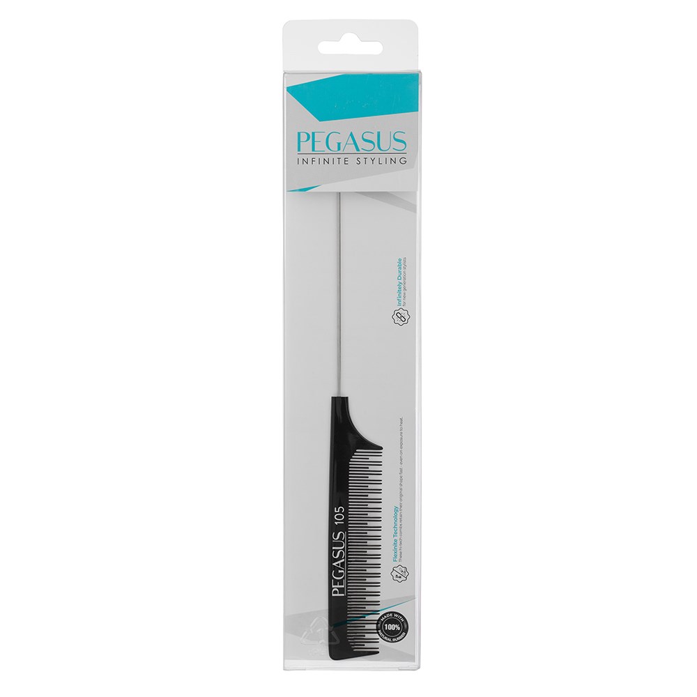 Storming Europe and the USA, Pegasus combs redefine styling. Combined with revolutionary Flexinite technology, Pegasus 105 Teasing Tail Comb Metal is styling at its best. Flexinite Smart Comb Technology creates seamless teeth which are sensitive to changing temperatures, mimicking hair and flexibly moving in response to heat and chemicals. The result? No damage to hair. Pegasus 105 Teasing Tail Comb features different teeth heights for volume and lift, plus a metal tail for sectioning hair. Always gentle on hair.