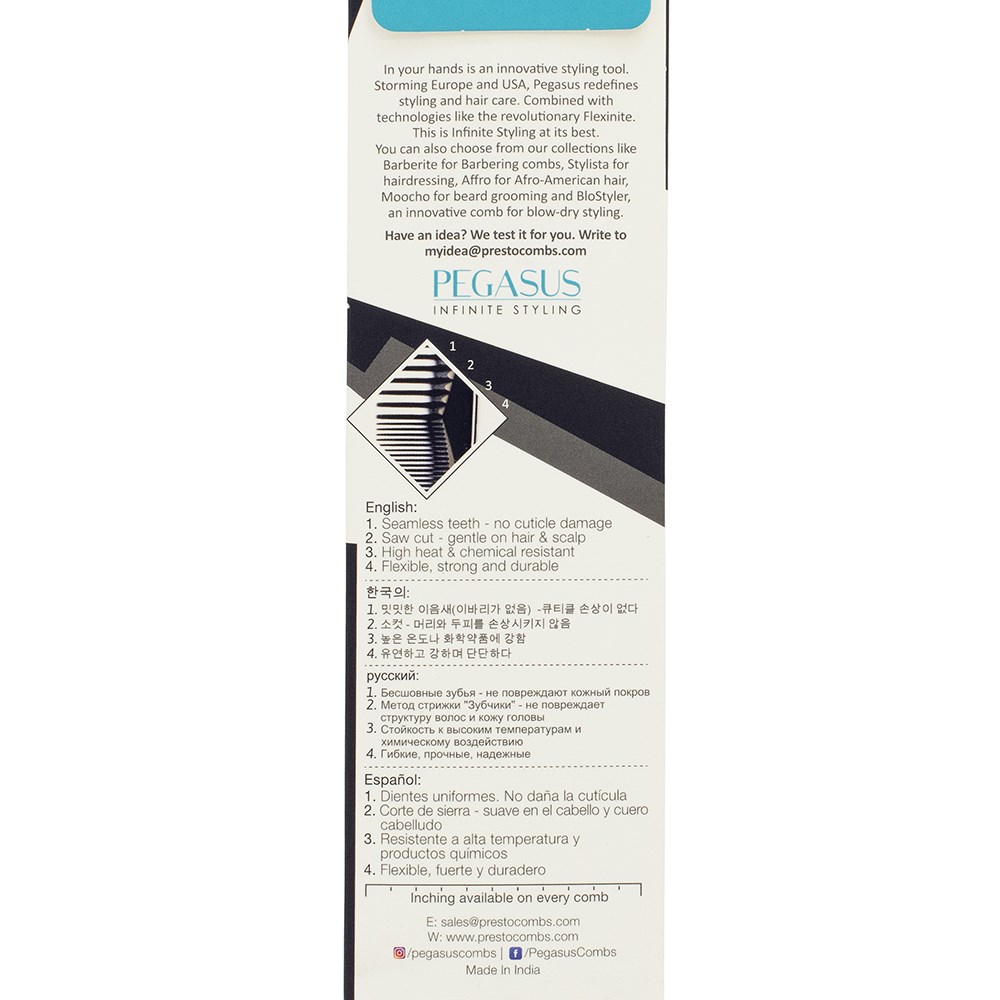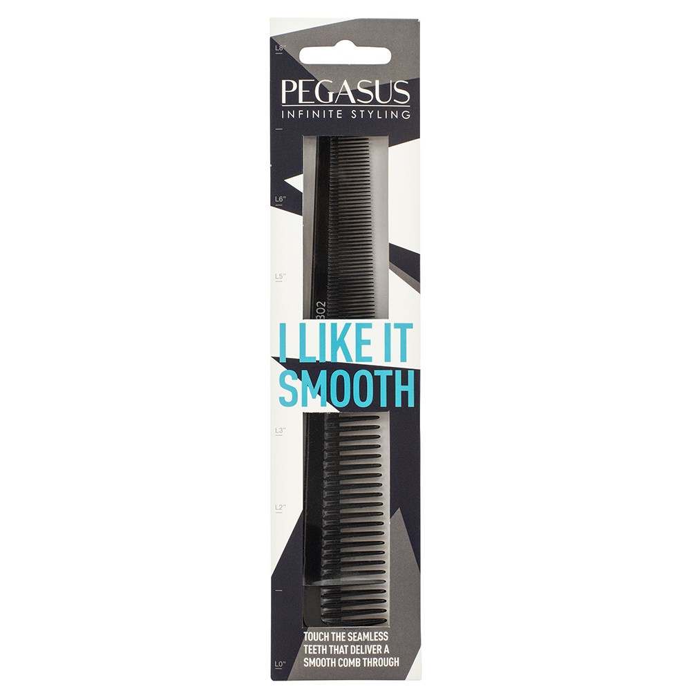 Storming Europe and the USA, Pegasus combs redefine styling. Combined with revolutionary Flexinite technology, Pegasus 302 Barber Comb Tapered is styling at its best. Flexinite Smart Comb Technology creates seamless teeth which are sensitive to changing temperatures, mimicking hair and flexibly moving in response to heat and chemicals. The result? No damage to hair. Pegasus 302 Barber Comb Tapered is ideal for cutting, barbering purposes, scissor over comb and edges. Two widths of teeth for different hair thickness.