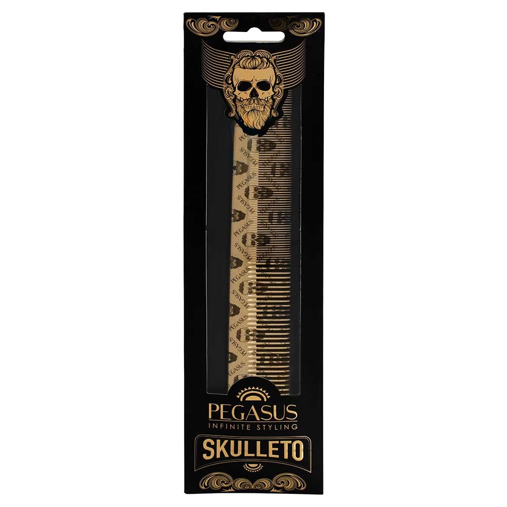The combs which redefined styling. With revolutionary Flexinite technology, Pegasus Skulleto 210 Cutting Comb in Gold is style creating style. Signature skull pattern in gold combines with revolutionary Flexinite Smart Comb Technology. Seamless, perfectly rounded teeth and firm grip delivers no-damage, infinite styling. Pegasus Skulleto 210 Cutting Comb in Gold is ideal for cutting, barbering, scissor over comb and edges.
