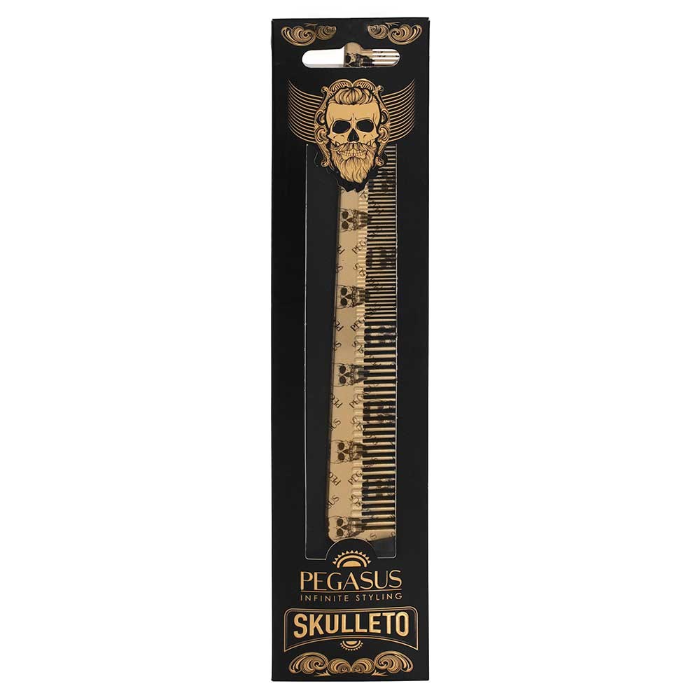 The combs which redefined styling. Pegasus Skulleto 303 Barber Tapered Comb in Gold is styling at its coolest. With signature skull print in gold, this comb features Flexinite Smart Comb Technology for seamless teeth which won’t damage hair. Ideal for cutting, barbering, scissor over comb and edges. Two widths of teeth for different hair thicknesses.