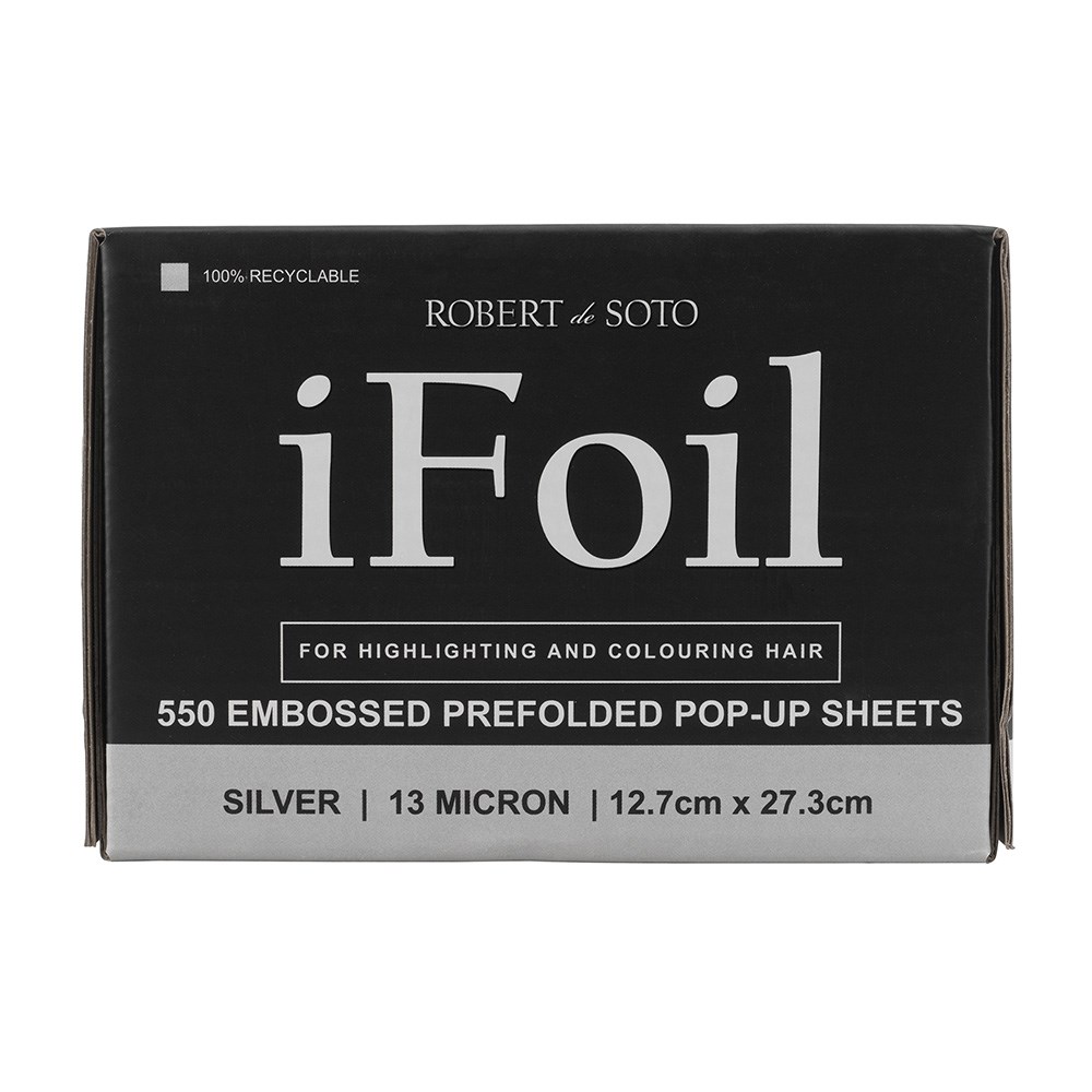 Fast and easy foil with embossing! Robert de Soto makes foil super convenient with iFoil Embossed Pop Up 13 Micron in Silver. This standard-sized foil is great for all foiling work in the salon environment. Pre-folded sheets save precious time – simply grab a foil and get going! Foils won’t stick together or bend out of shape. Embossing on the foils grips the hair better than traditional foil, ensuring no slippage. 550 pre-folded, pop-up sheets. 100% recyclable. 13 microns and 12.7cm W x 27.3cm L in size.