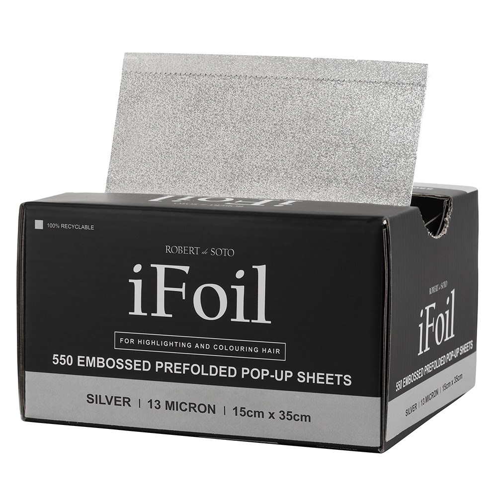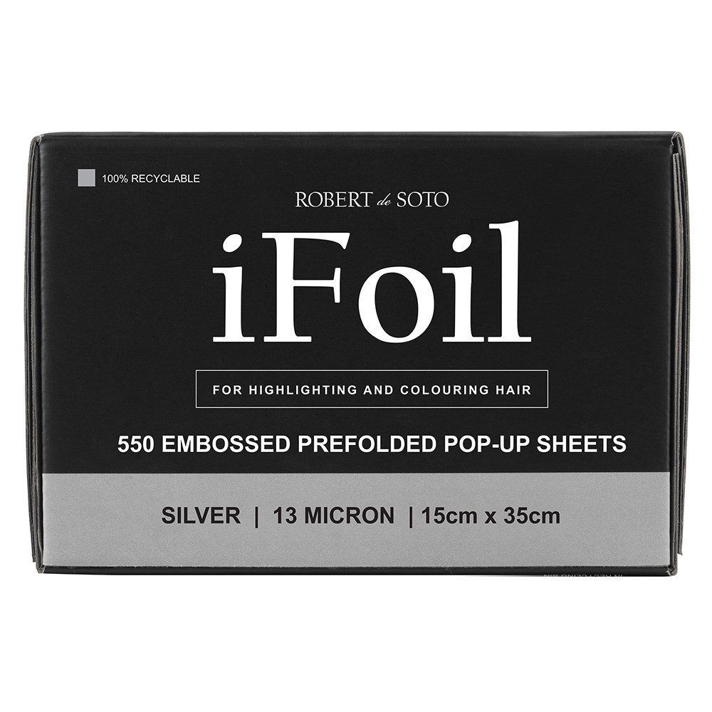 Fast and easy foil with embossing! Robert de Soto makes hairdressing foil super convenient with iFoil Embossed Pop Up 13 Micron Wide Long Silver. This wide and long foil is great for all foiling work in the salon environment. Pre-folded sheets save precious time – simply grab a foil and get going! Foils won’t stick together or bend out of shape. Embossing on the foils grips the hair better than traditional foil, ensuring no slippage. 550 pre-folded, pop-up sheets. 100% recyclable. 13 microns and 15cm x 35cm in size.