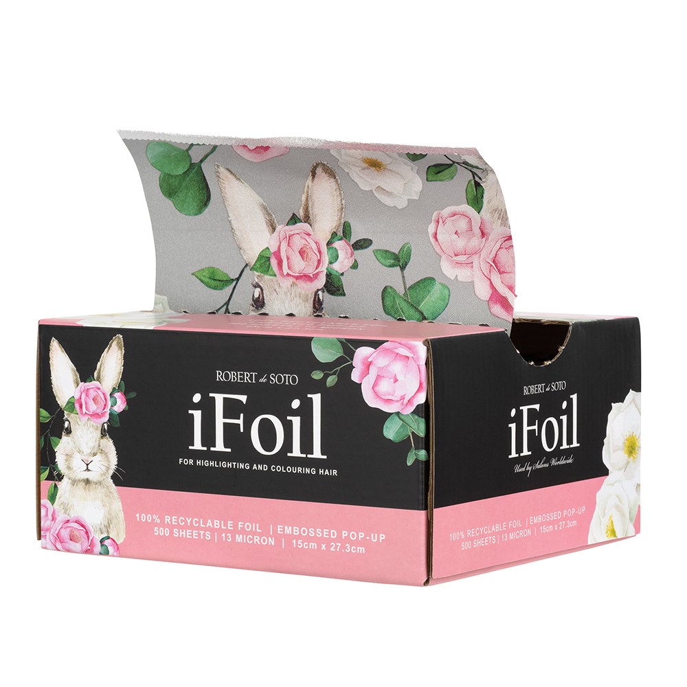 Add a little fun to your salon style! Great for all colouring services, this patterned Robert de Soto iFoil Embossed Pop Up Bunny in Large is foil with flair. With 100% recyclable foil , each box contains a generous 500 sheets and features a small push-up action underneath for convenience when foil is running low. No cutting, no hassle – each large sized sheet measures 15cm x 27.3cm, giving you extra space for certain colouring services. The easy pop-up dispenser makes life easier, while the embossed foil’s much needed grip prevents slippage.