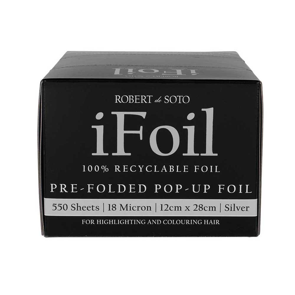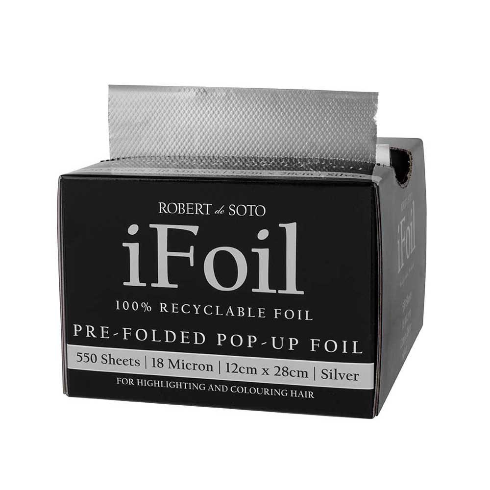 Fast and easy pre-folded hairdressing foil. Robert de Soto makes foil super convenient with his iFoil Pre-Folded Pop-Up in Silver 18 Micron. This 100% recyclable foil is all about ensuring colouring and highlighting is easy and efficient. The convenient tissue box style dispenser contains 550 pre-folded sheets of 18 microns each, designed to simply pop up. No cutting, no hassle!