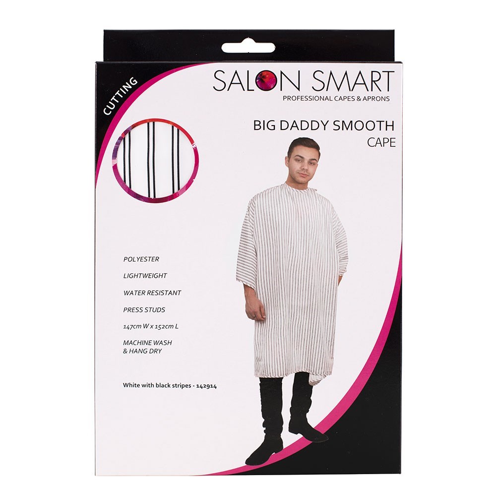 Salon Smart Big Daddy Cool Cutting Cape White is made from water resistant polyester with for maximum client protection. The adjustable press stud snap closure ensures a comfortable fit for all clients. Extra-large cape size for practicality. Cold machine wash and hang dry.