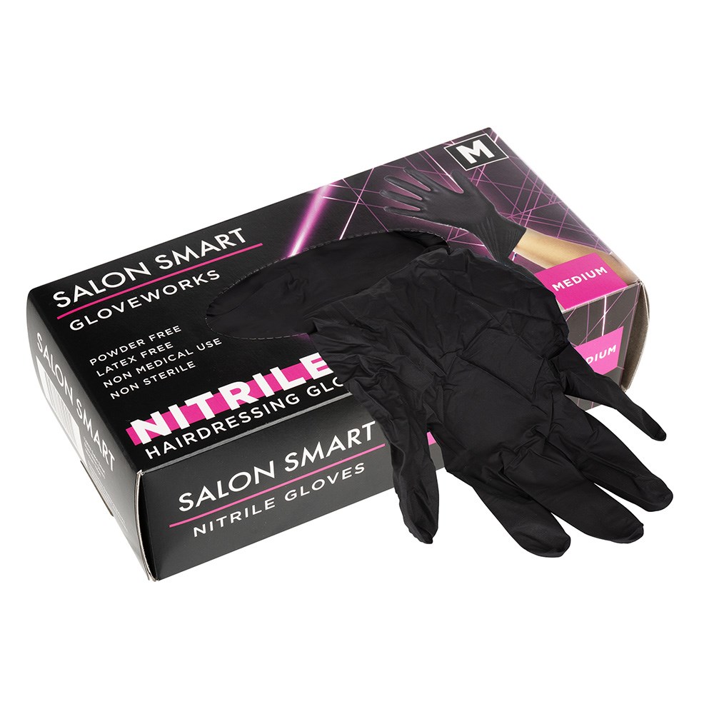 Salon Smart Nitrile Gloves Black Medium 100pk offer superior puncture resistance. No more fears of tearing or ripping your gloves when you use Salon Smart Nitrile Gloves! Gloves are powder-free and textured, as well as latex-free and suitable for those with latex allergies. Perfect for non-medical, salon use.