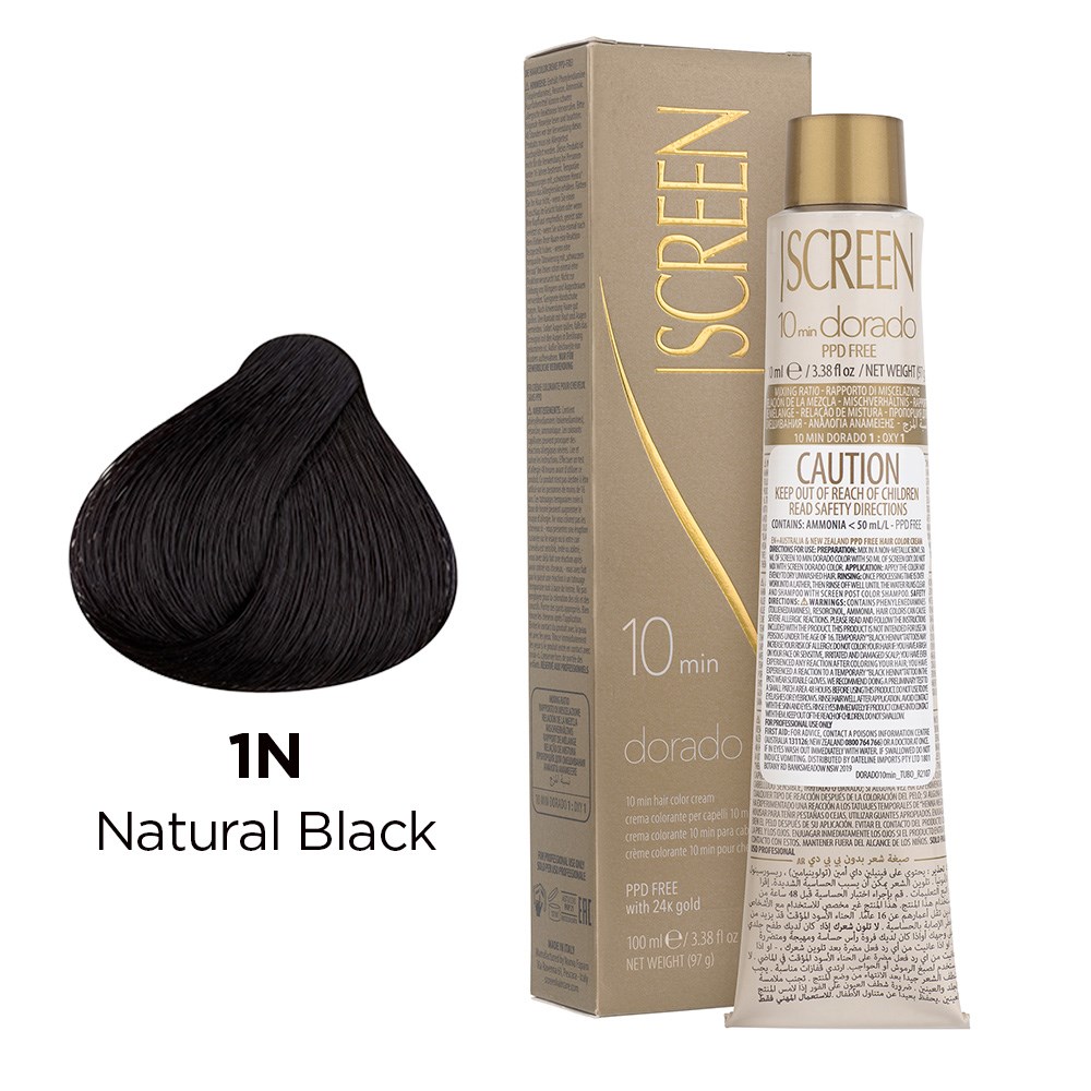 Ultra-fast, efficient and high performance, Screen 10 Min Dorado Hair Colour Cream 1N Natural Black is a salon dream. With only 10 minutes processing time, this PPD-free and paraben-free colouring cream is ideal for root touch-ups, grey coverage and male clients desiring colour blending. Enriched with 24K gold for incredible light-reflecting results, vibrant shine and rich vibrancy. Maximum grey coverage and uniform, long-lasting results. Only 10 minutes to incredible colour with superb tonal richness! Elite colour created in Italy.
