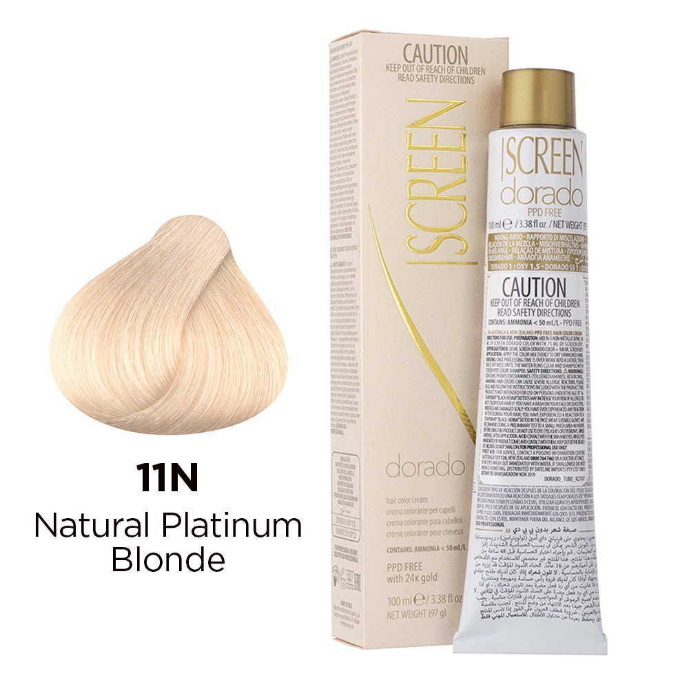 Precious cream colour with unique tonal richness. Developed in a wide range of colours, Screen Dorado Hair Colour Cream 11N Natural Platinum Blonde is the culmination of advanced technology, research and continuous testing. This hair colouring cream is PPD-free and enriched with 24K gold for results which are truly incredible. Microparticles of gold reflect light, multiplying the brilliance of colour. Colour is intensely rich and exceptionally long-lasting. Maximum grey coverage and balanced, uniform results. Elite colour created in Italy.