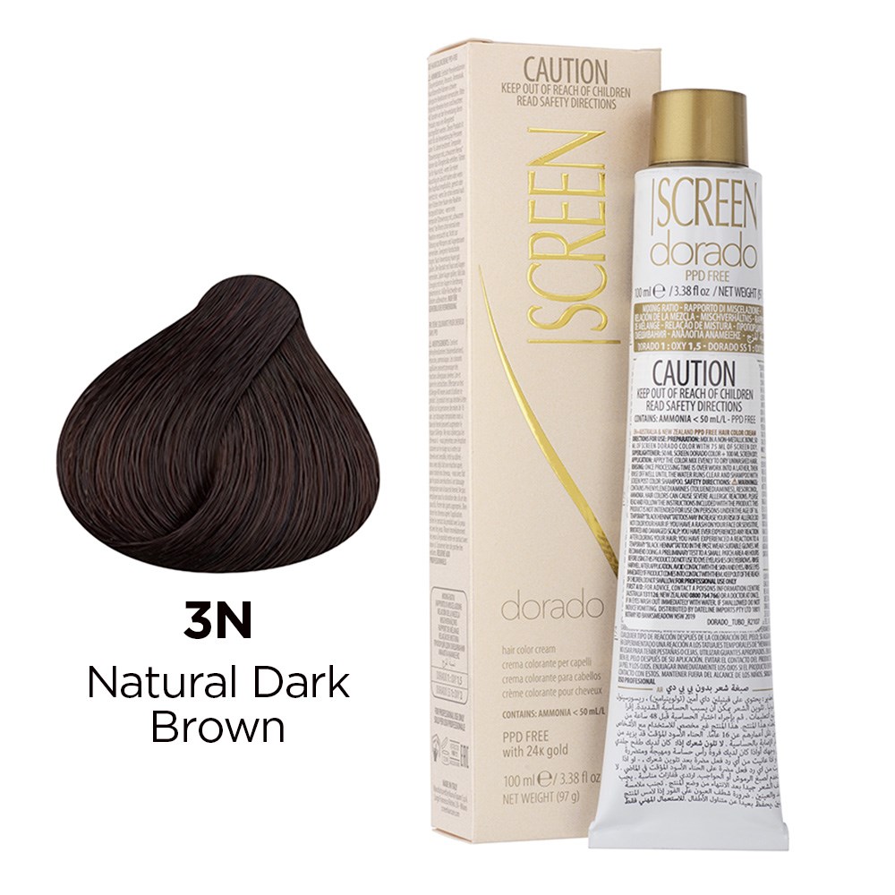 Precious cream colour with unique tonal richness. Developed in a wide range of colours, Screen Dorado Hair Colour Cream 3N Natural Dark Brown is the culmination of advanced technology, research and continuous testing. This hair colouring cream is PPD-free and enriched with 24K gold for results which are truly incredible. Microparticles of gold reflect light, multiplying the brilliance of colour. Colour is intensely rich and exceptionally long-lasting. Maximum grey coverage and balanced, uniform results. Elite colour created in Italy.