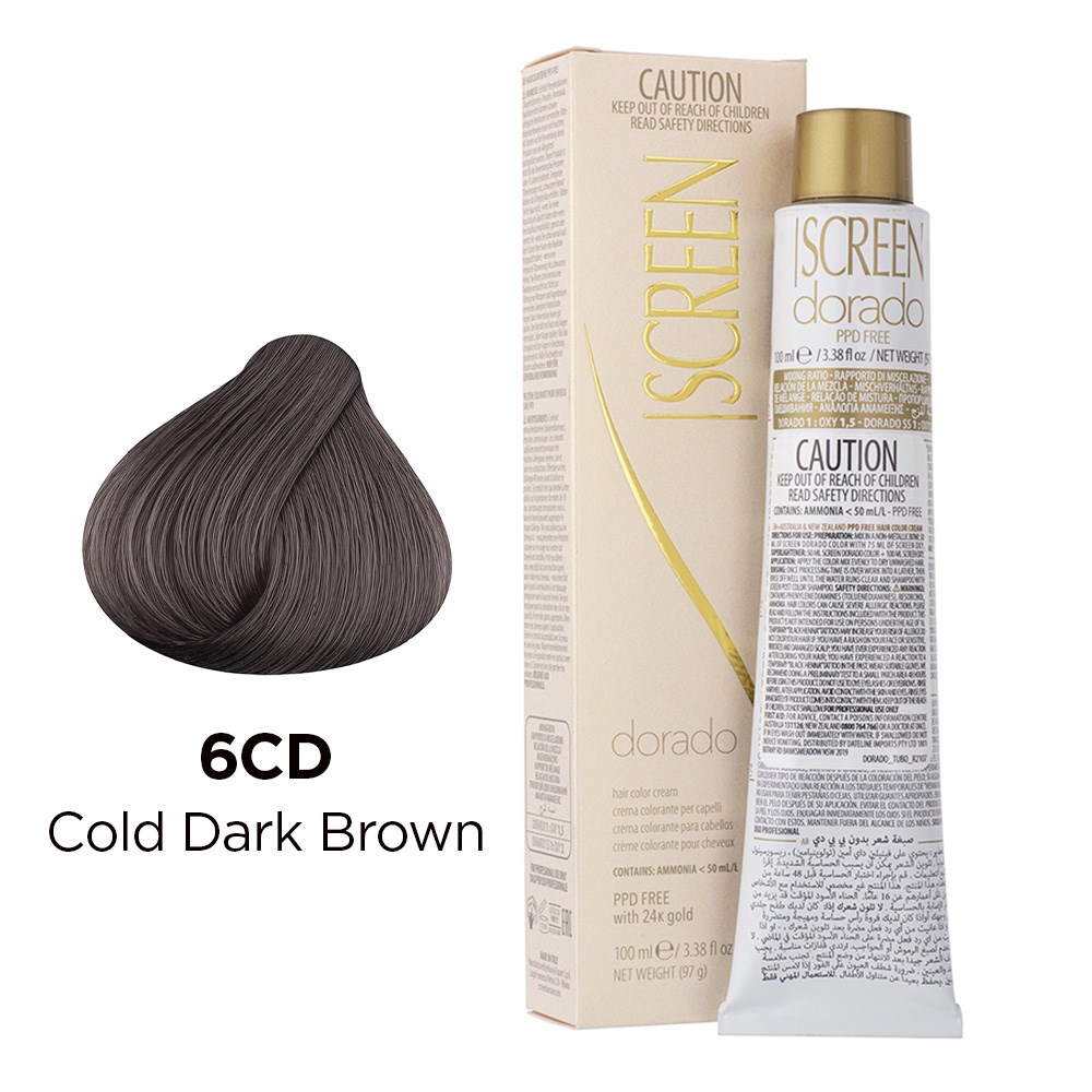 Precious cream colour with unique tonal richness. Developed in a wide range of colours, Screen Dorado Hair Colour Cream 6CD Cold Dark Brown is the culmination of advanced technology, research and continuous testing. This permanent hair colouring cream is PPD-free and enriched with 24K gold for results which are truly incredible. Microparticles of gold reflect light, multiplying the brilliance of colour. Colour is intensely rich and exceptionally long-lasting. Maximum grey coverage and balanced, uniform results. Elite colour created in Italy.