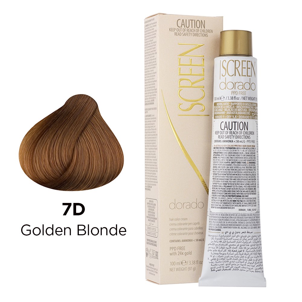 Precious cream colour with unique tonal richness. Developed in a wide range of colours, Screen Dorado Hair Colour Cream 7D Golden Blonde is the culmination of advanced technology, research and continuous testing. This hair colouring cream is PPD-free and enriched with 24K gold for results which are truly incredible. Microparticles of gold reflect light, multiplying the brilliance of colour. Colour is intensely rich and exceptionally long-lasting. Maximum grey coverage and balanced, uniform results. Elite colour created in Italy.
