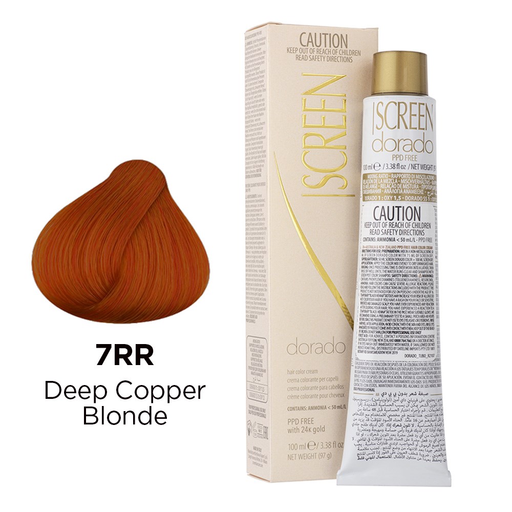 Precious cream colour with unique tonal richness. Developed in a wide range of colours, Screen Dorado Hair Colour Cream 7RR Deep Copper Blonde is the culmination of advanced technology, research and continuous testing. This hair colouring cream is PPD-free and enriched with 24K gold for results which are truly incredible. Microparticles of gold reflect light, multiplying the brilliance of colour. Colour is intensely rich and exceptionally long-lasting. Maximum grey coverage and balanced, uniform results. Elite colour created in Italy.
